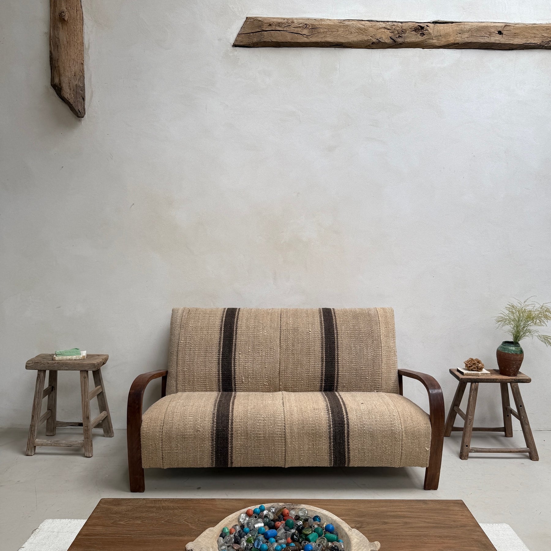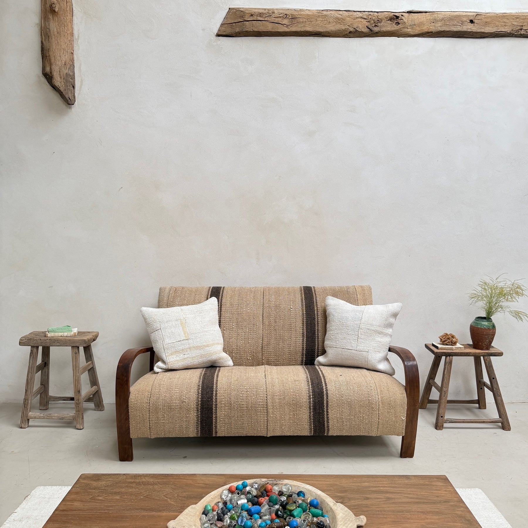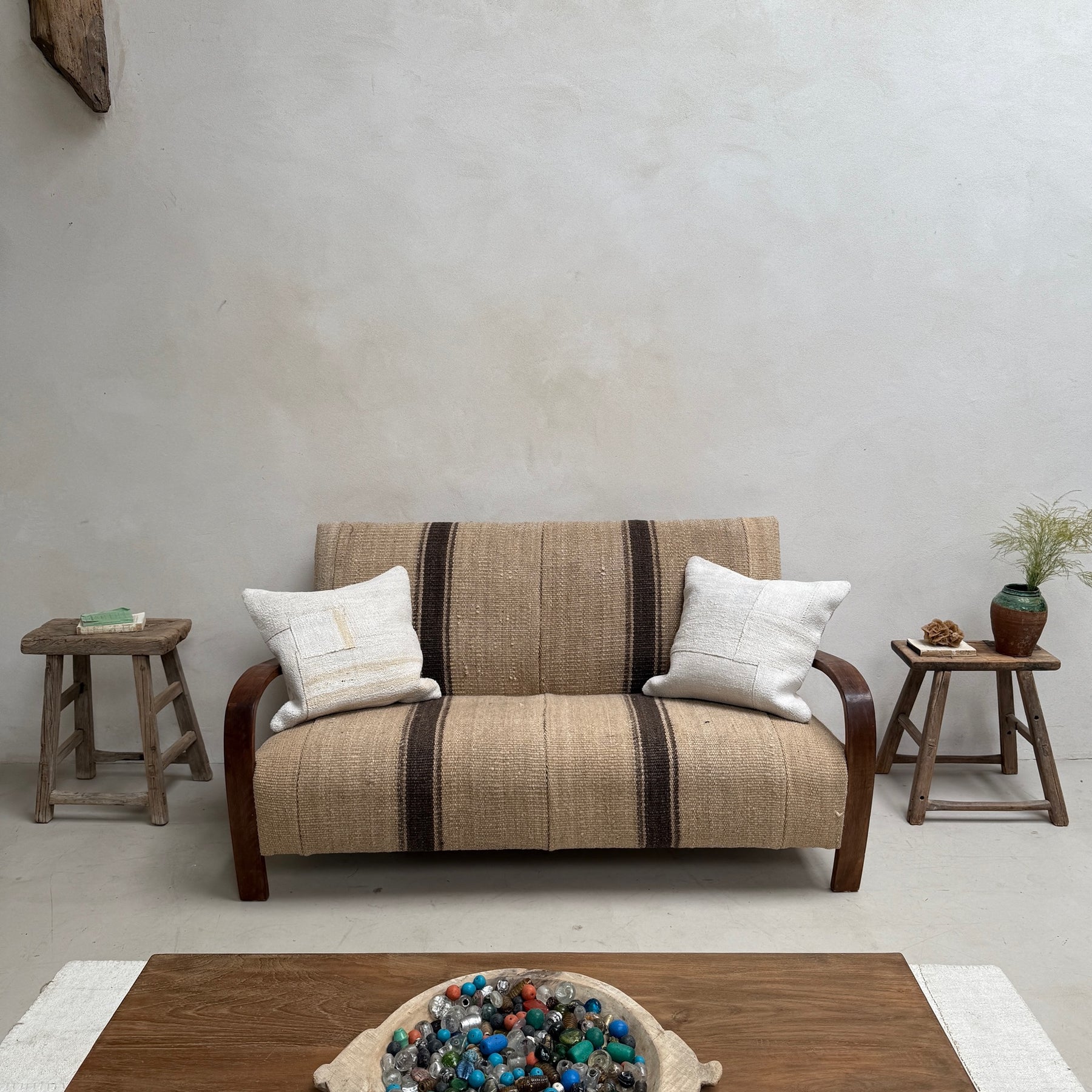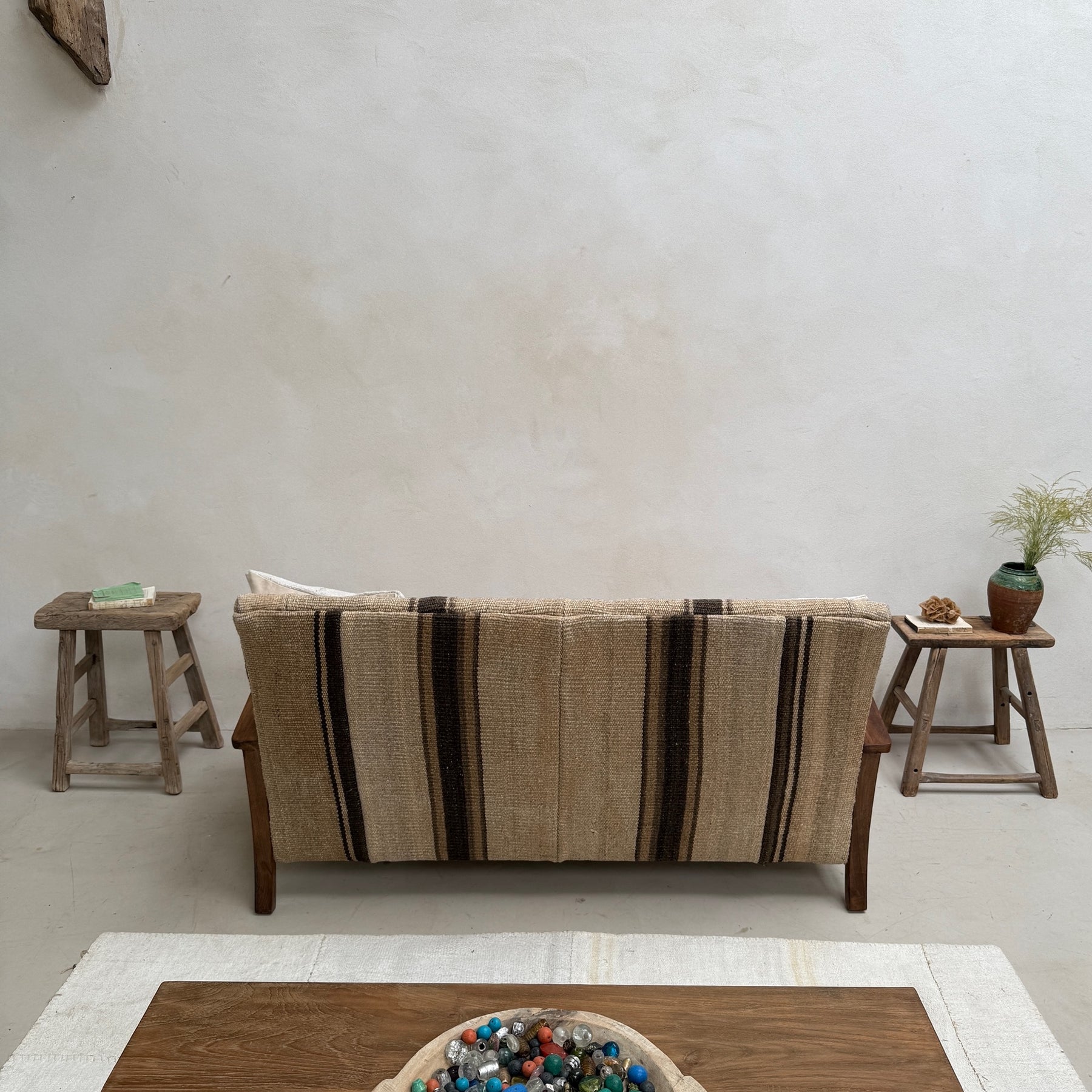 A wonderful handcrafted wooden framed sofa, upholstered in stunning antique Moroccan haik woven fabric.
