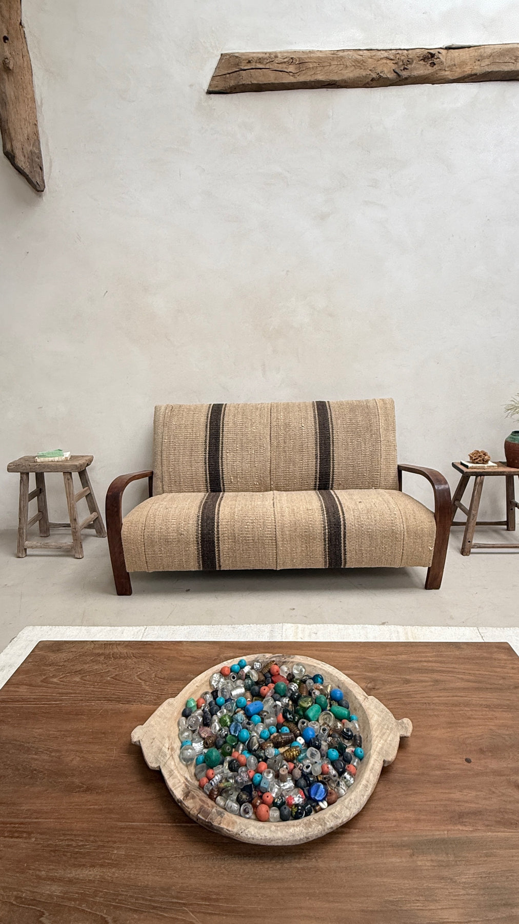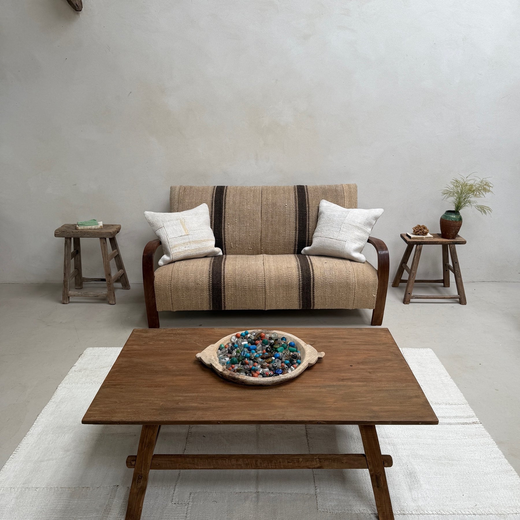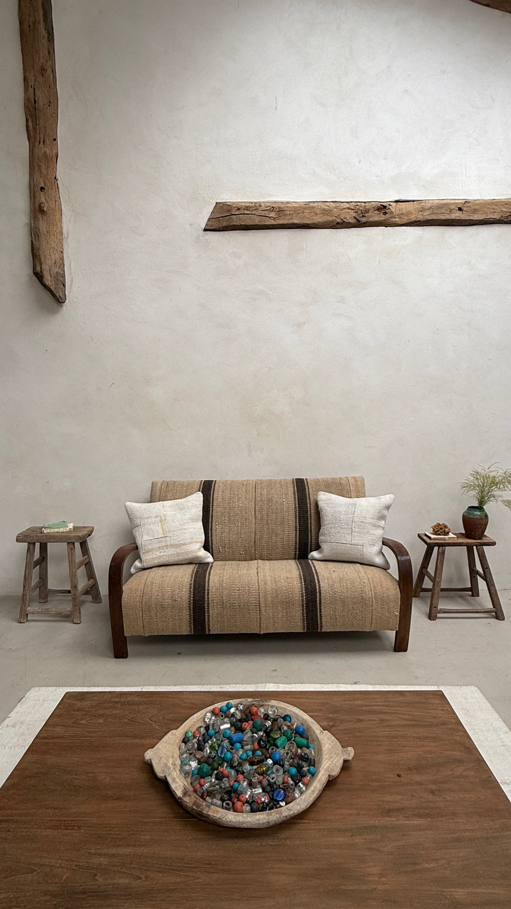 A wonderful handcrafted wooden framed sofa, upholstered in stunning antique Moroccan haik woven fabric.