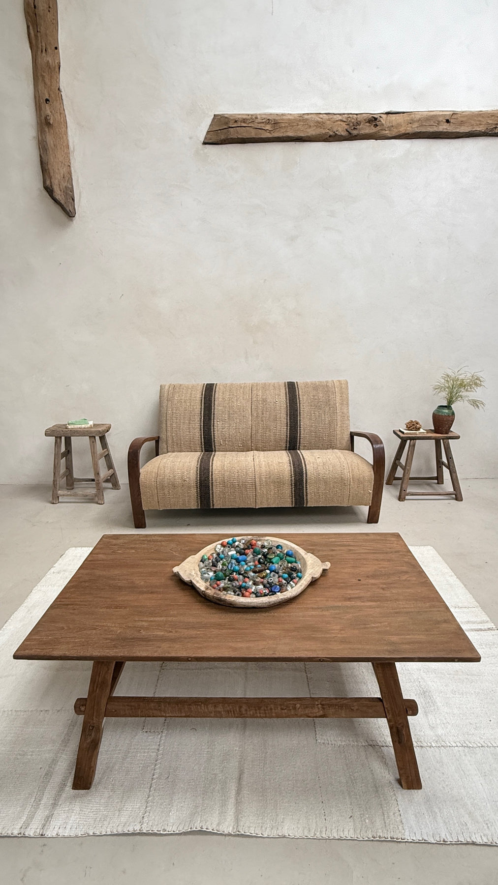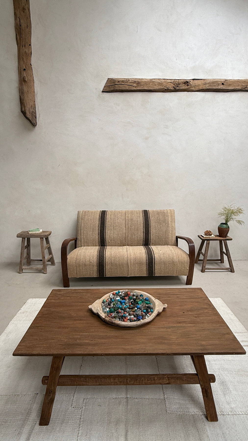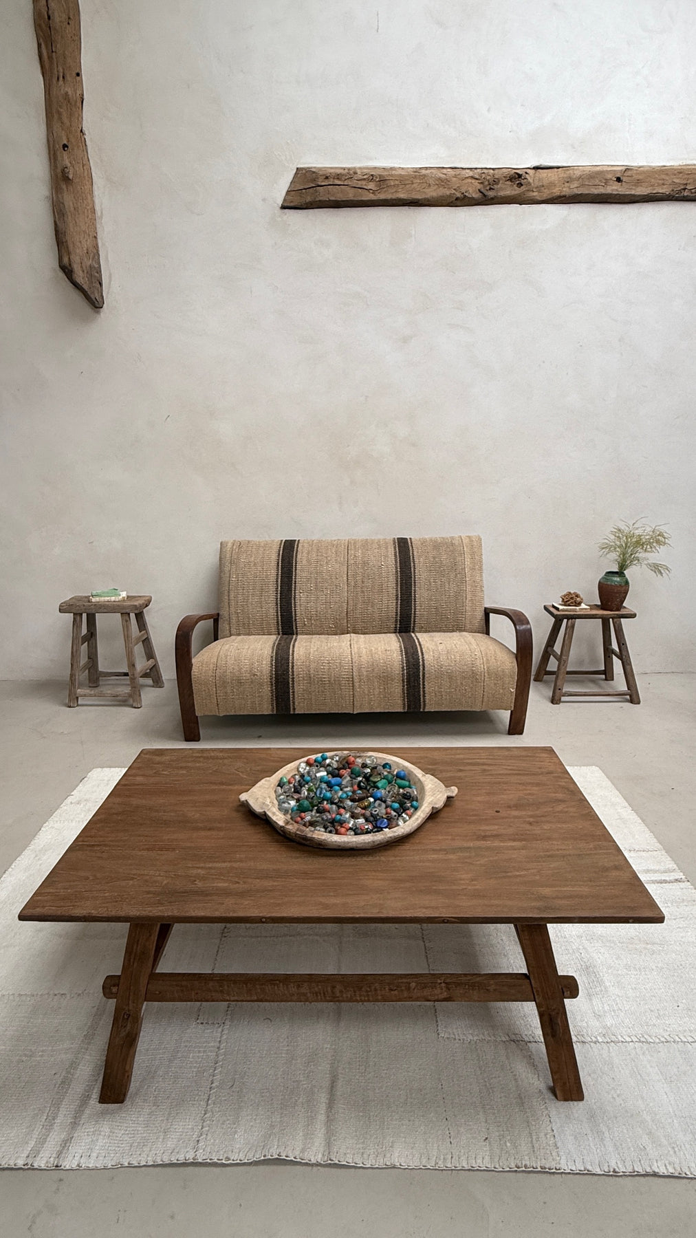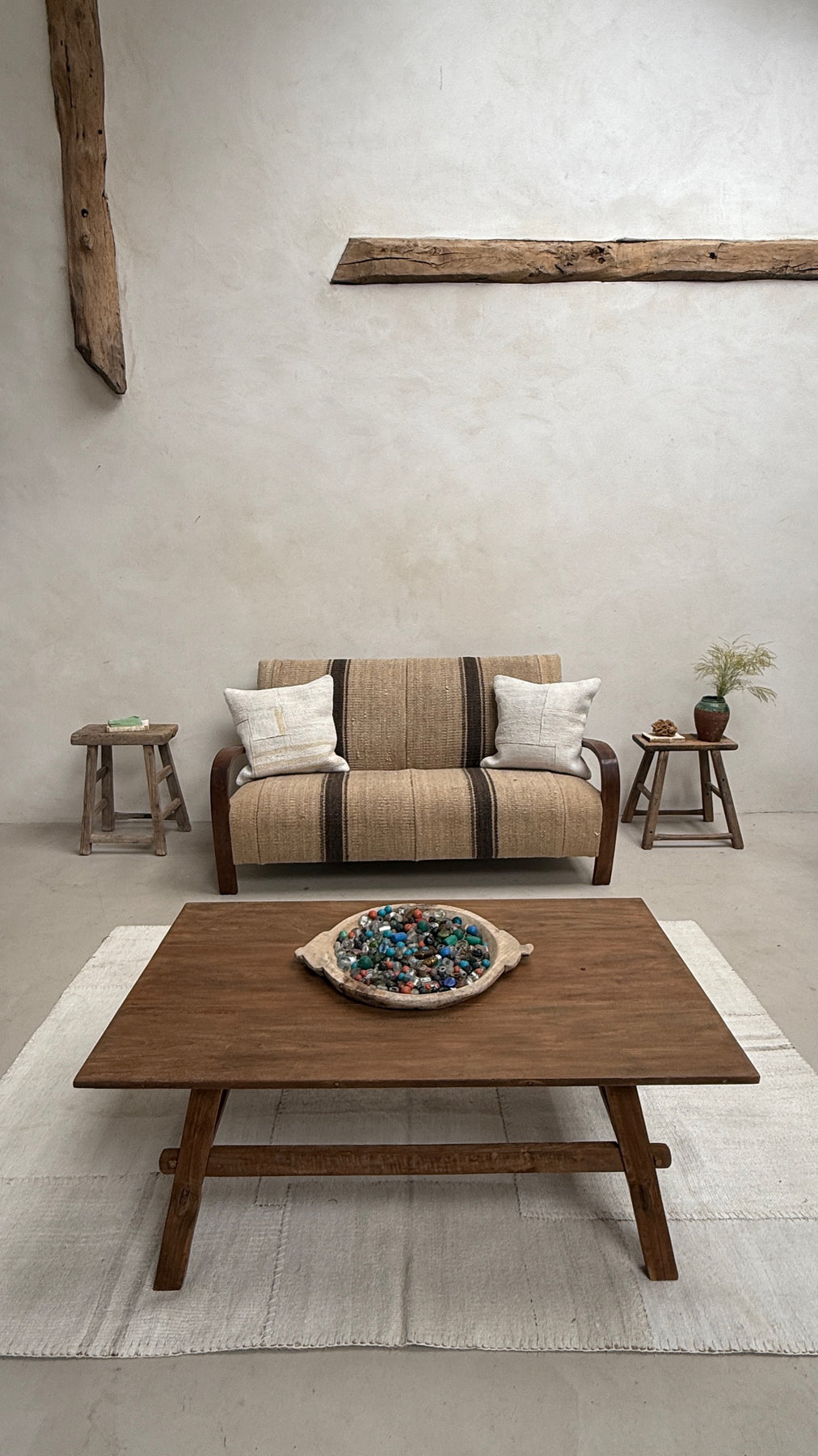 A wonderful handcrafted wooden framed sofa, upholstered in stunning antique Moroccan haik woven fabric.