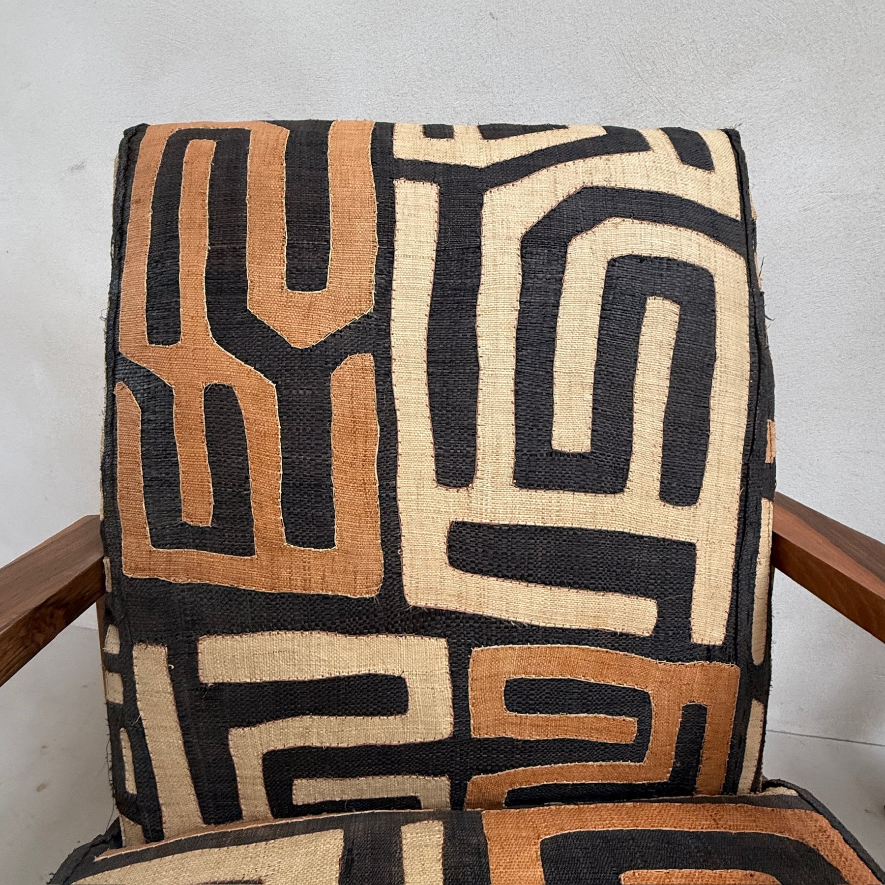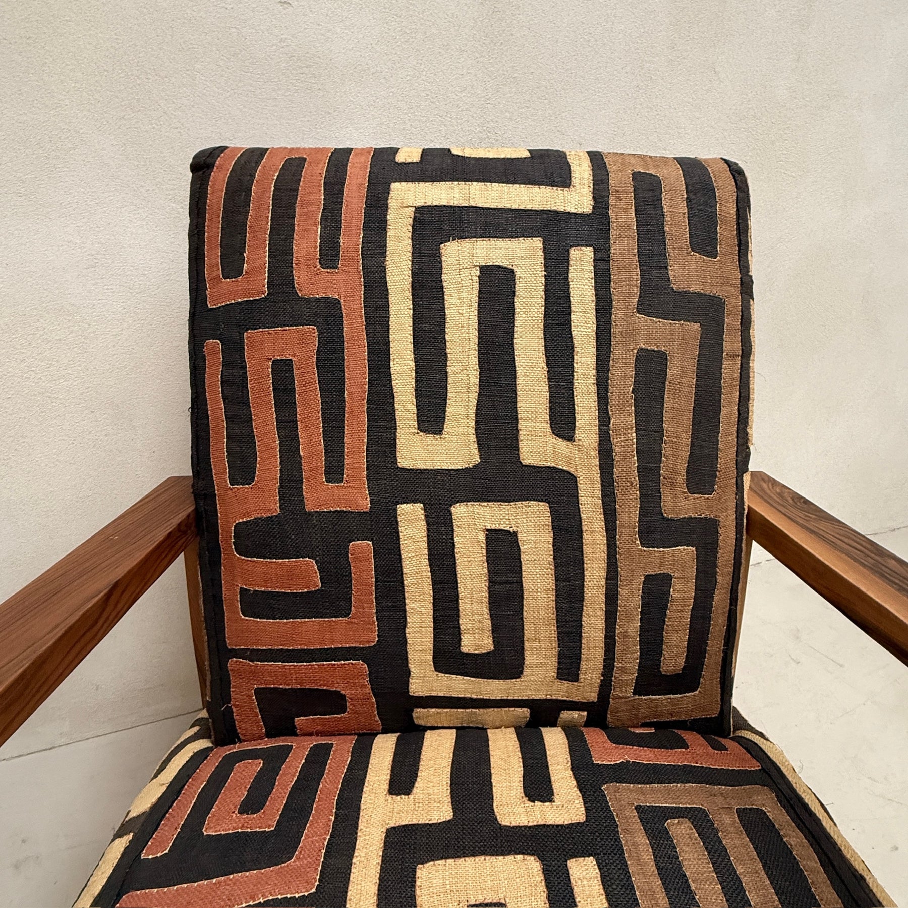 A wonderful handcrafted wooden framed armchair, upholstered in stunning vintage hand-appliquéd African Kuba cloth.