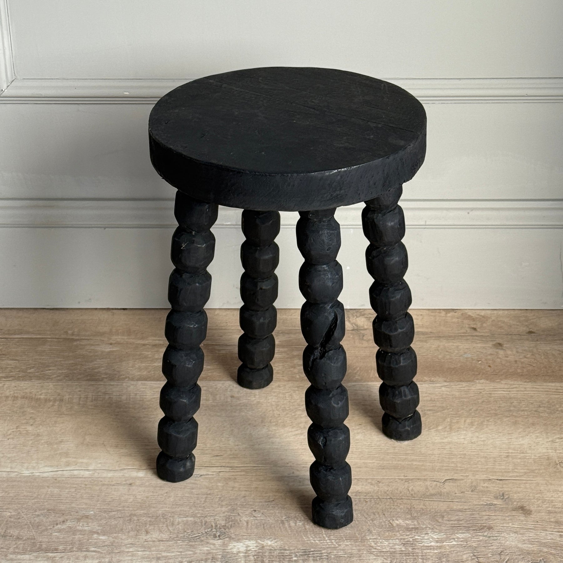 A lovely organically shaped black wooden round stool with a traditional hand-carved bobbin legs. Perfect as a side table in a living room or beside a bed.