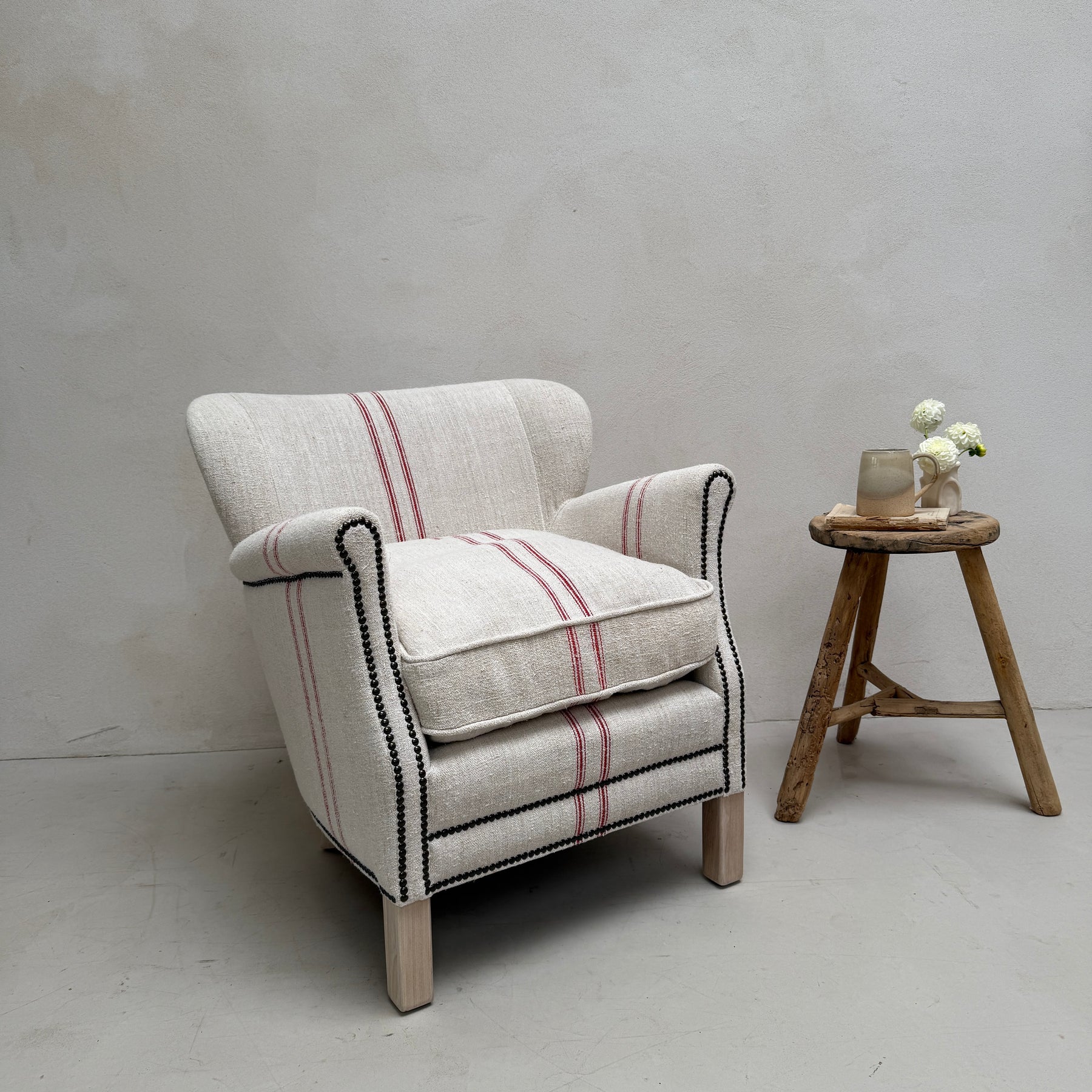 These armchairs are newly made exclusively for Home Barn in a traditional vintage French style and upholstered with fabulous vintage French grain sack upholstery and stud detailing.