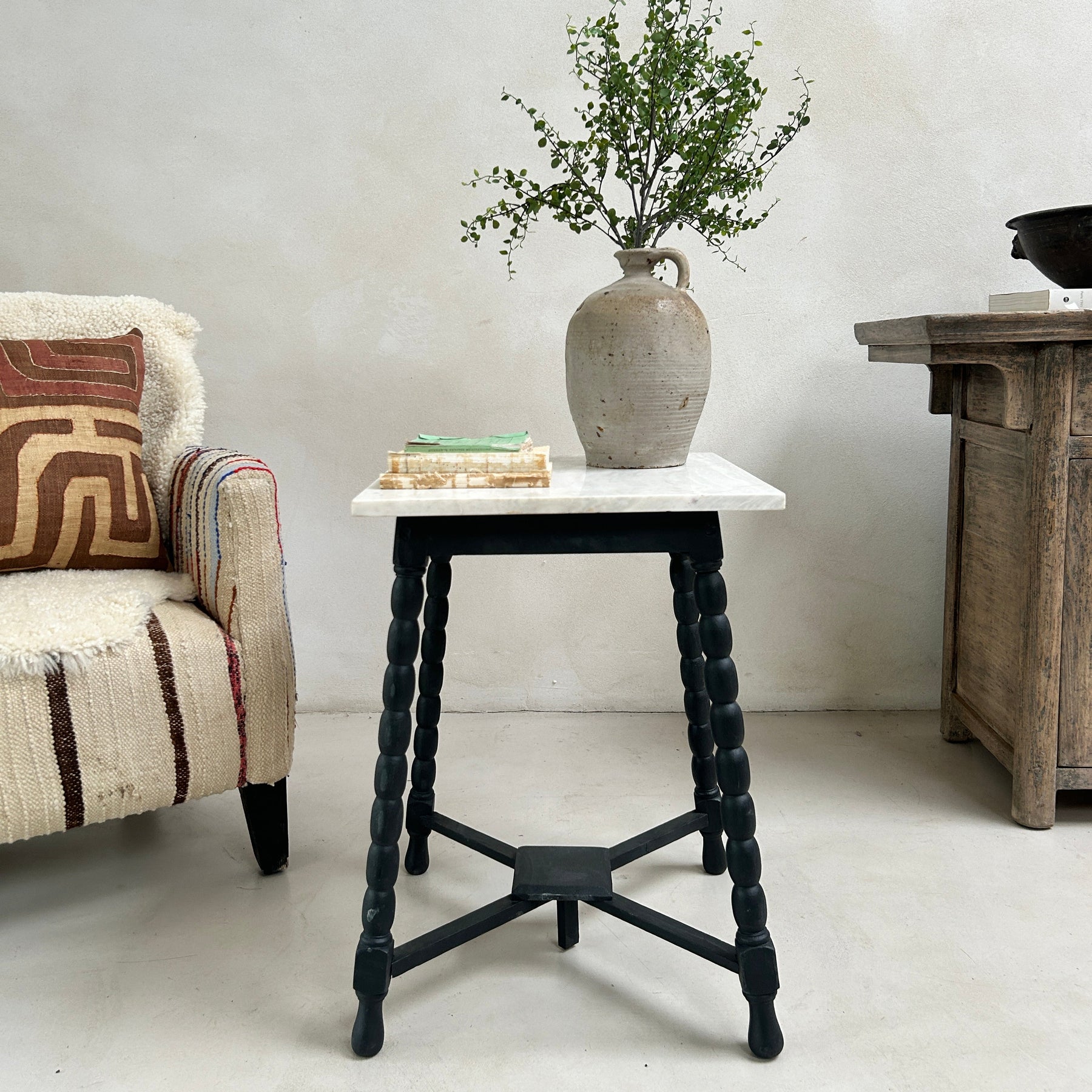 A refined side table combining a white marble top with a contrasting dark painted bobbin turned wooden base. The square marble surface has natural veining throughout, giving each piece subtle variation and a sense of individuality.