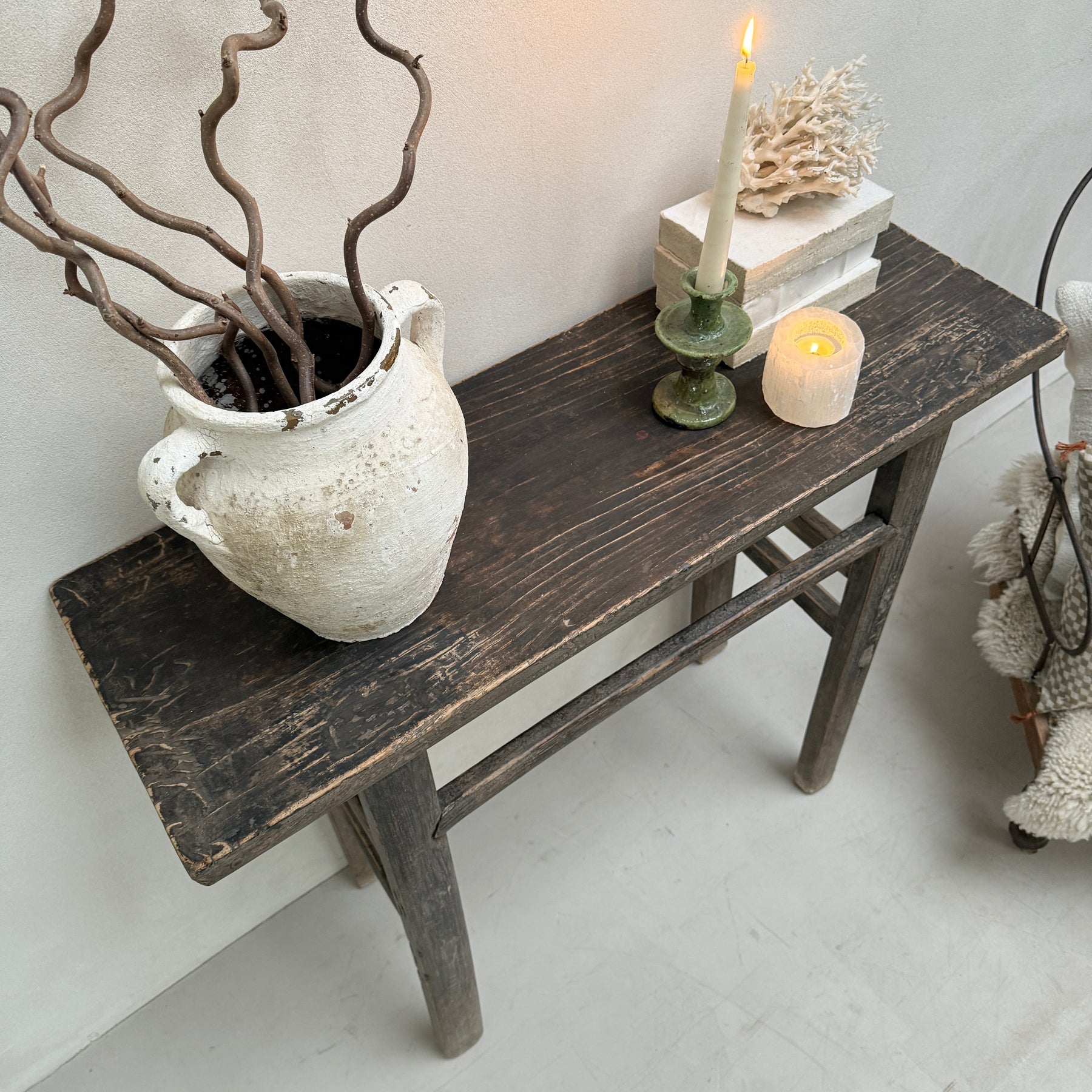 This console table is a charming and original piece constructed from smooth and weathered solid timbers. Imperfections and historic marks are not generally sanded from the surface but are left visible to celebrate the age and history of the item. Historic woodworm holes may be evident and will have been treated. Minor variations and imperfections are therefore to be expected and embraced.