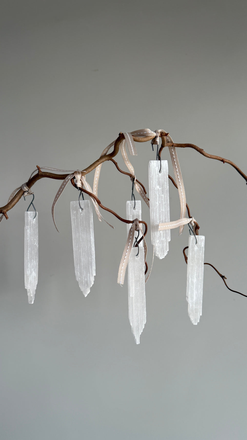 Set of six natural selenite stick drops which look like icicles. Selenite is a natural crystal with a semi translucent appearance. Perfect for a window or branch year round and of course on your tree in December.