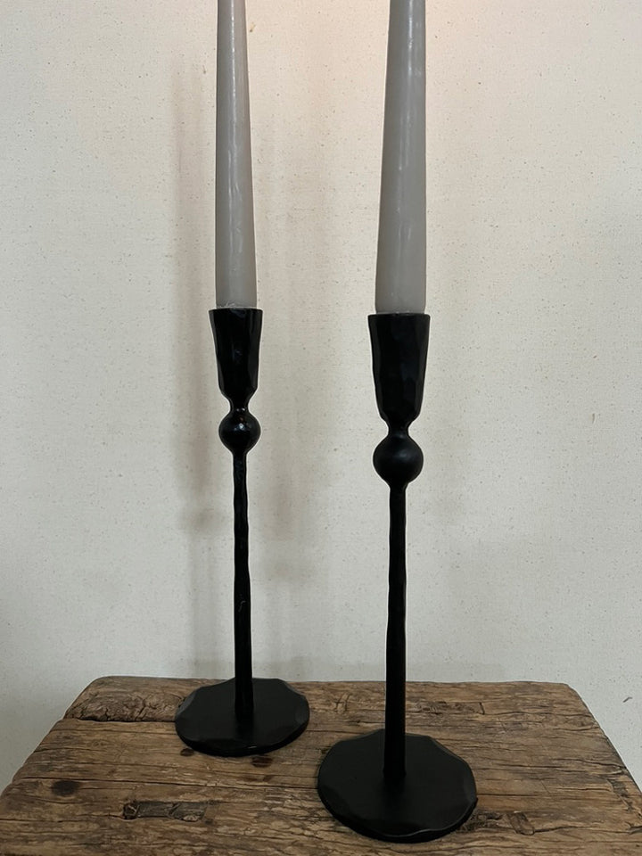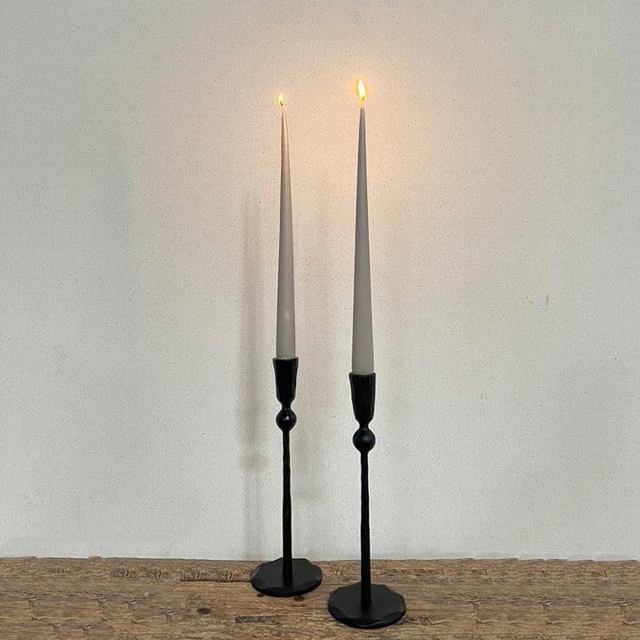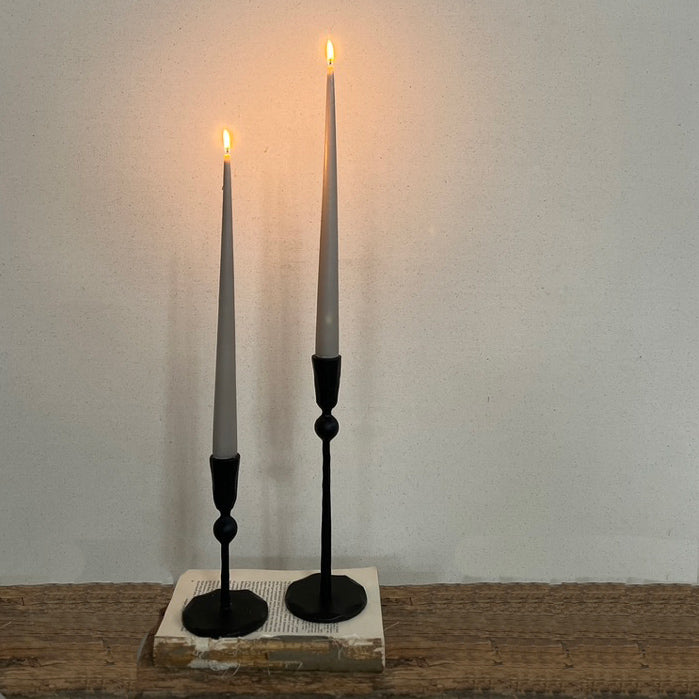 Made of solid black iron cast by hand, each black metal candlestick holds a standard-sized tapered candle.