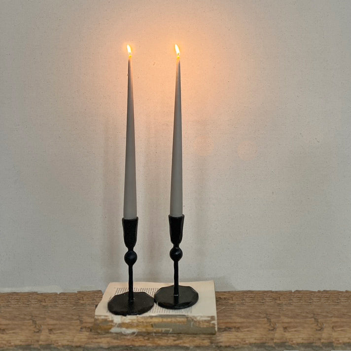 Made of solid black iron cast by hand, each black metal candlestick holds a standard-sized tapered candle.