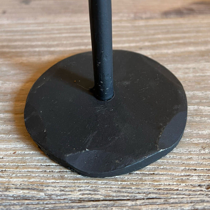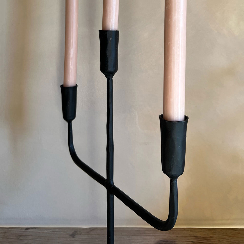 A fabulous contemporary hand-forged metal three arm candelabra. Made of solid iron, this elegant candelabra would make the perfect addition to your dinner party table. It would also look great on a console table or coffee table to add a touch of elegance to your room. These holders fit a standard-sized candle.