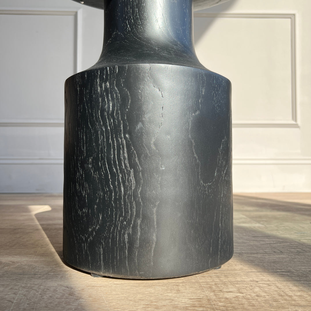 Our Neran side table is made from solid teak and the wood grain shows through the painted black surfaces.