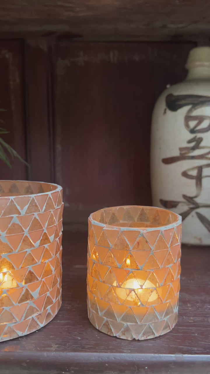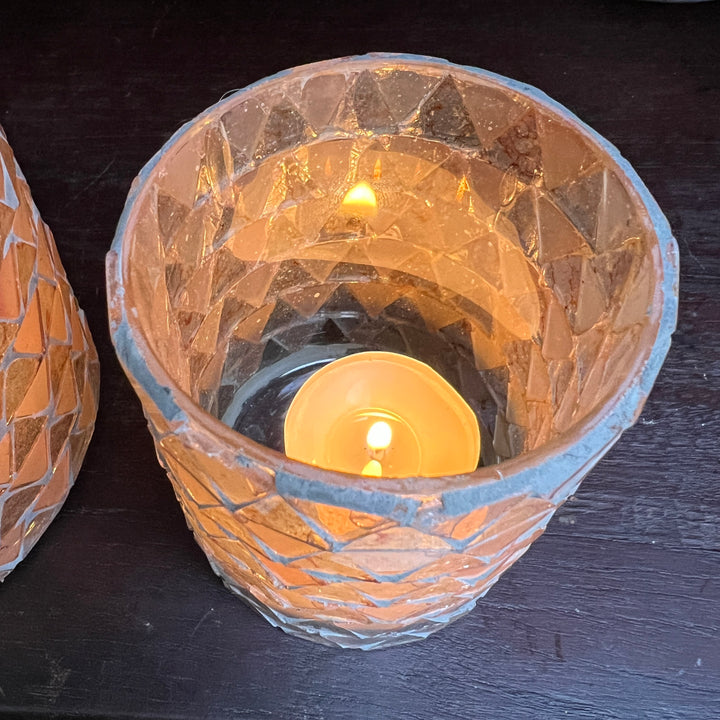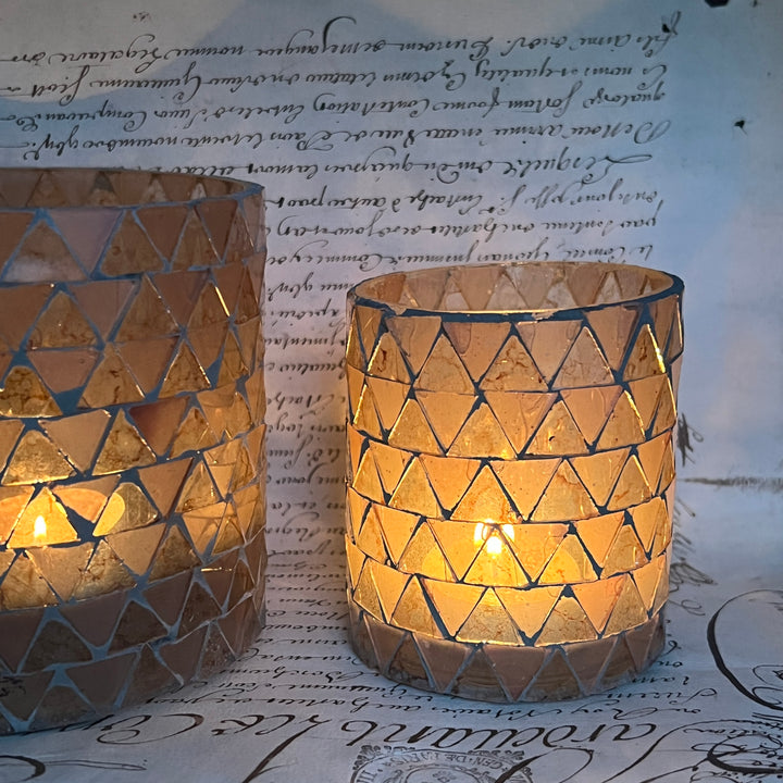 A stunning handmade glass votive, our blush mosaic tea light holder will fit a single small tea light candle. This artisan item is made from irregular hand made glass pieces and will create the perfect ambient glow in any room.