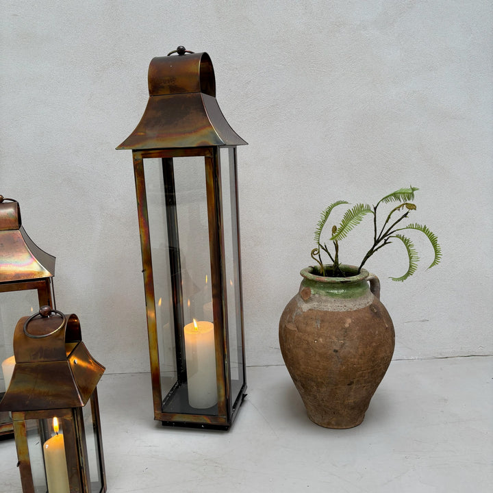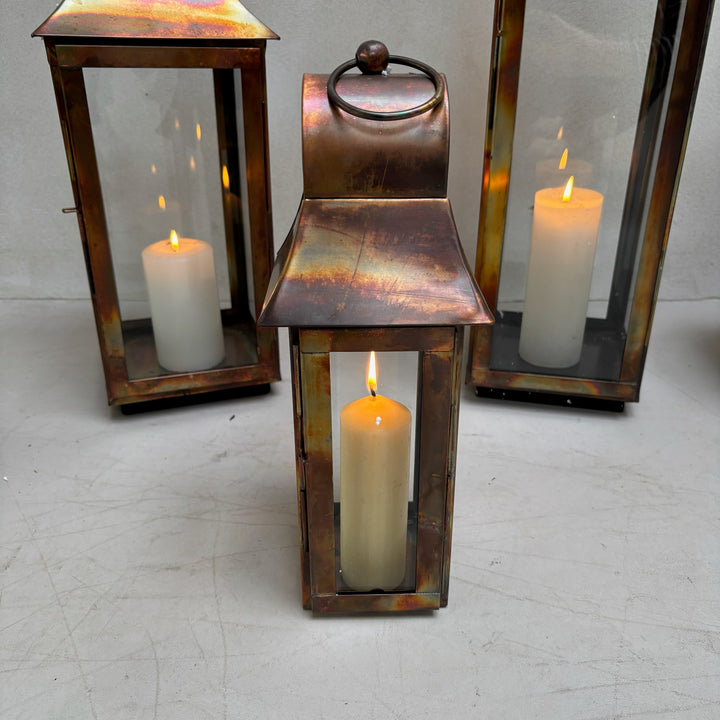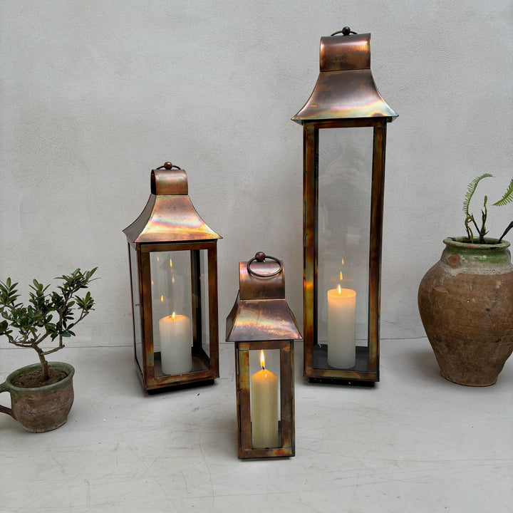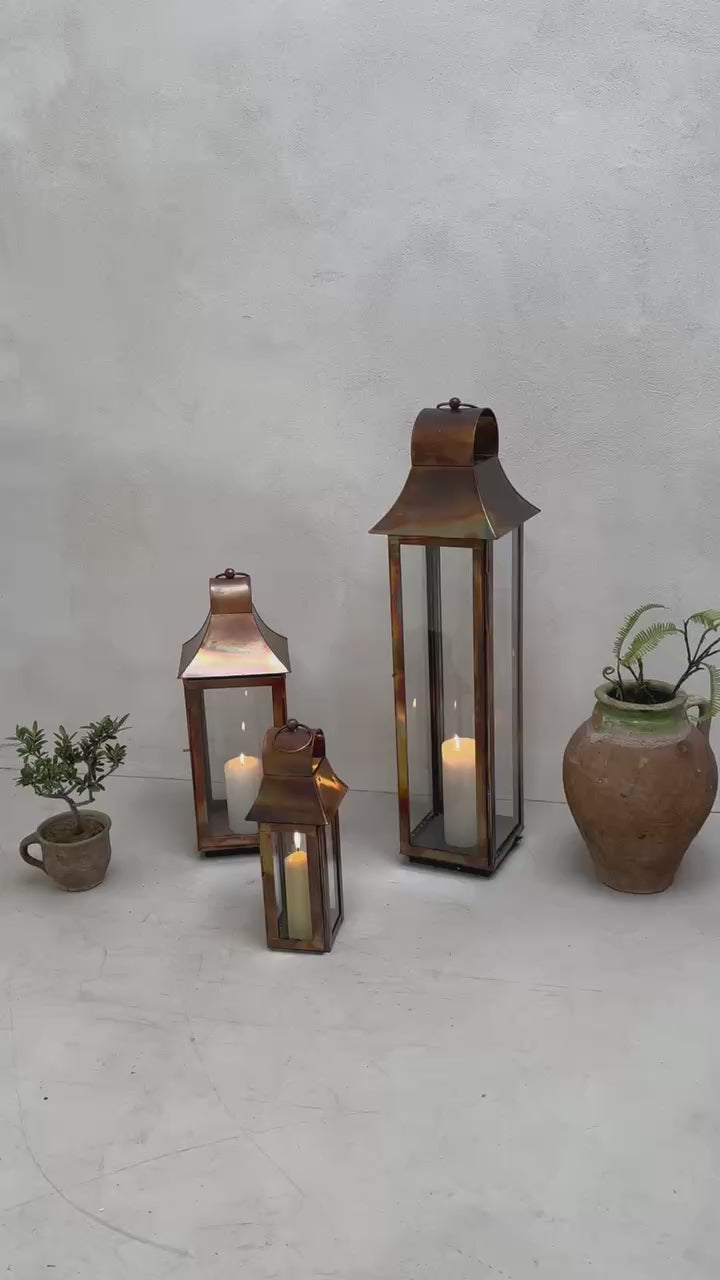 Elevate your home or garden with our burnished copper glass lanterns. Perfect lanterns for a simple pillar candle.