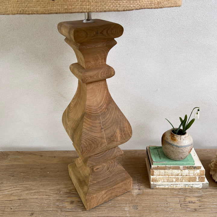 This Square Carved Wooden Table Lamp adds a sculptural touch to any lounge or dining space. Featuring a hessian style shade, this lamp provides both style and function. With its unique design, it is the perfect addition to any home decor.
