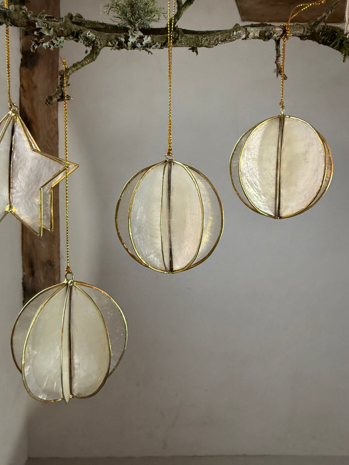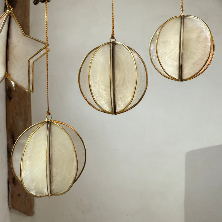 Sustainably made from crushed oyster shells this rigid decoration is made from six sections of pearlescent crushed shell which is opaque and has a slight iridescence to it's surfaces. Framed with brass edges this decoration is robust and yet lighweight.