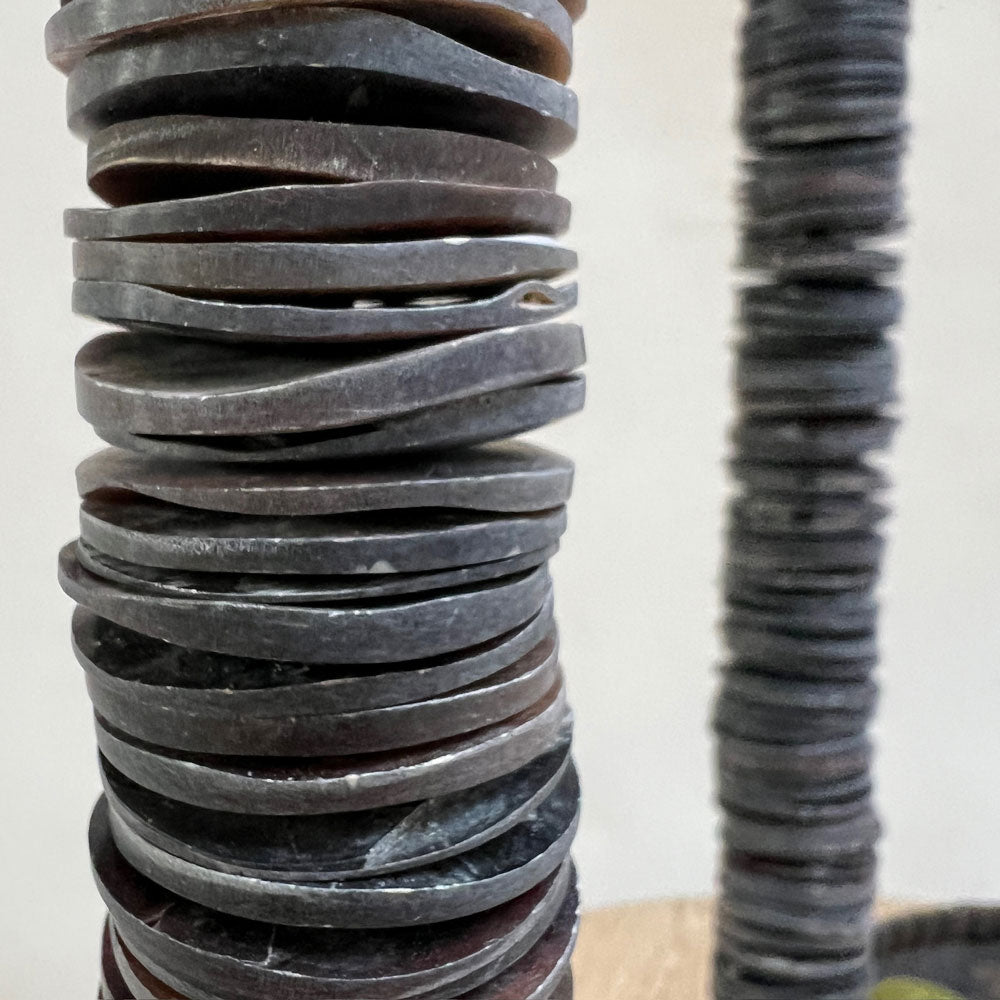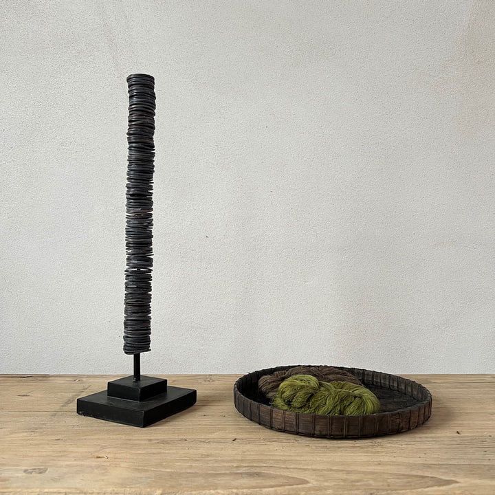 A stunning Indonesian decorative money tower artwork. Crafted from a collection of original antique Indonesian trading counters, these shell discs are wonderfully aged and weathered with a fabulous patina, Worn smooth through years of use, the discs were originally a functional item and would probably have been used historically as everyday trading currency.