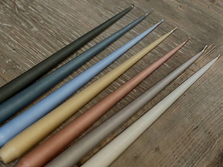 Our 32cm tall taper candles are handcrafted in Denmark. Hand-dipped, highest-quality candles with a very slow burn time. These beautiful candles are non-drip when there is no draft present in the room. The elegant shape of these beautiful simply stunning candles will add graceful charm to your dining table. The candles are designed with a tapered bottom to allow them to fit most candle holders.