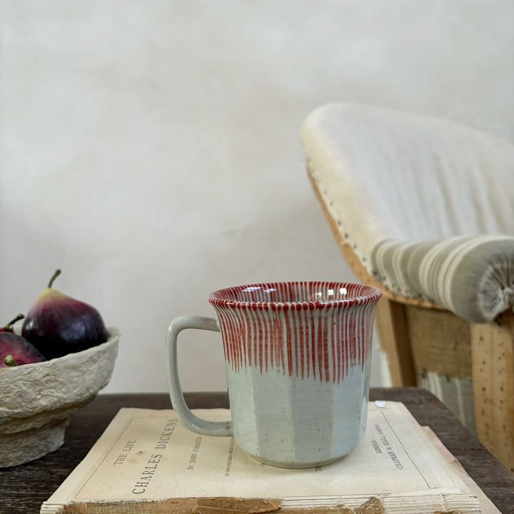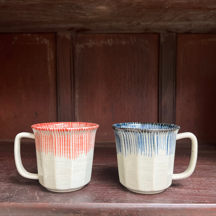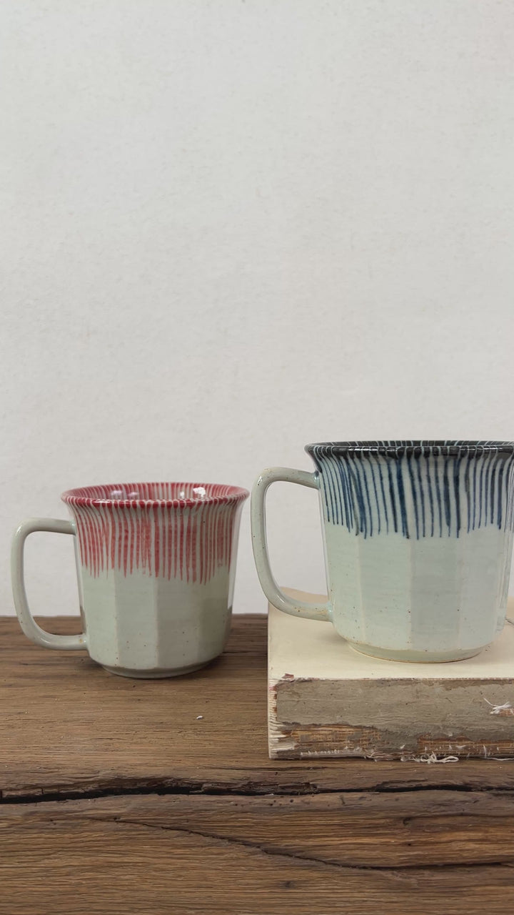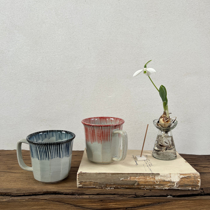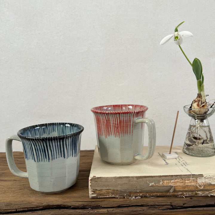 The Kin faceted mug with vertical lines has a delightful hexagonal shape and is expertly crafted in Japan.