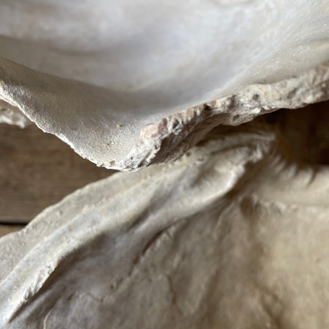 A stunning clam shell formed from stone particles. This stylish hand made item has the texture and form of a natural clam shell. The shell is raised on low plinth base allowing it to stand with stability. This item is made in a mold which is cast from an original natural clam shell.