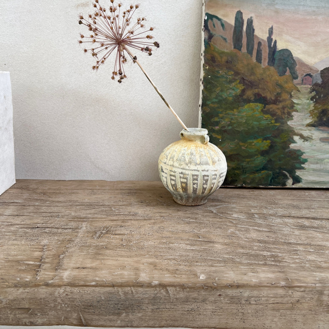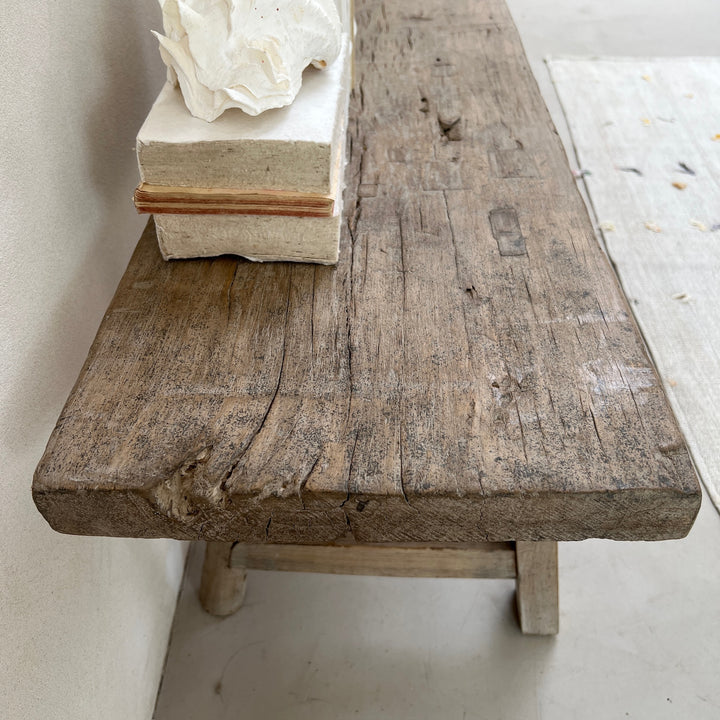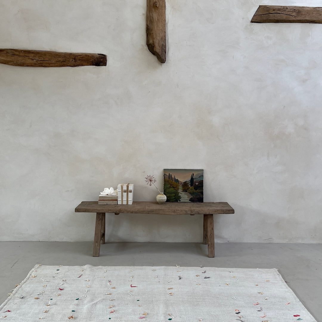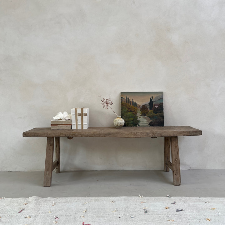 The bench’s natural, weathered finish and charming patina make it ideal for contemporary rustic, natural, or minimalist interiors. Versatile in use, it fits perfectly at the end of a bed, in a hallway, boot room, or even as a dining bench.