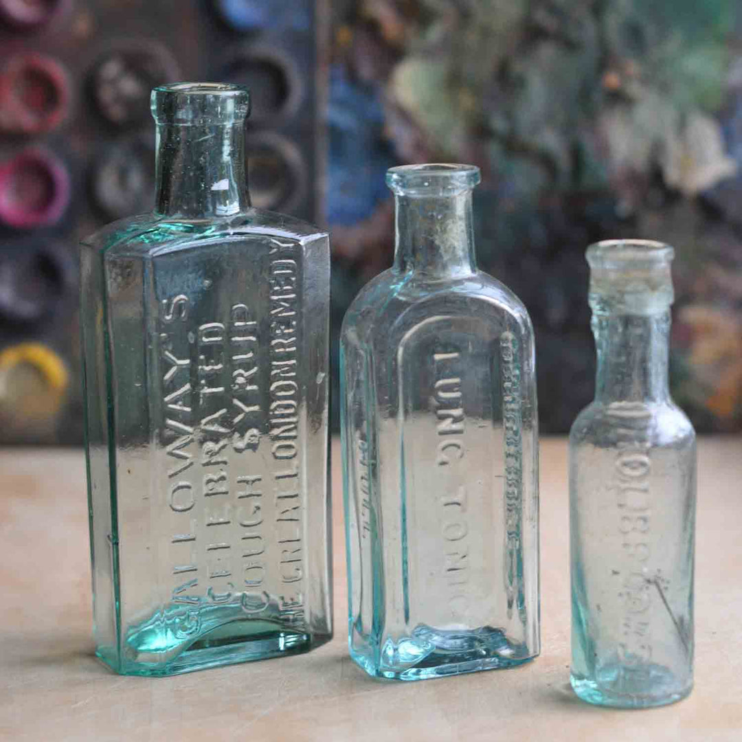 A charming collection of Victorian glass bottles which would have contained amongst other things boot polish, beard oil, medicines, blackening paste, lungs tonic and foodstuffs. Each bottle is approximately 100 years old. They make amazing vases for wildflowers or single stems.