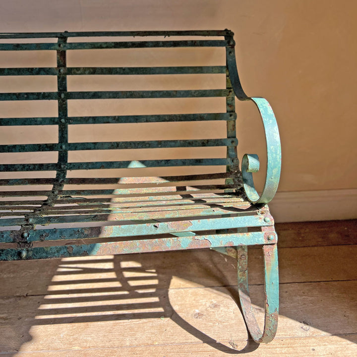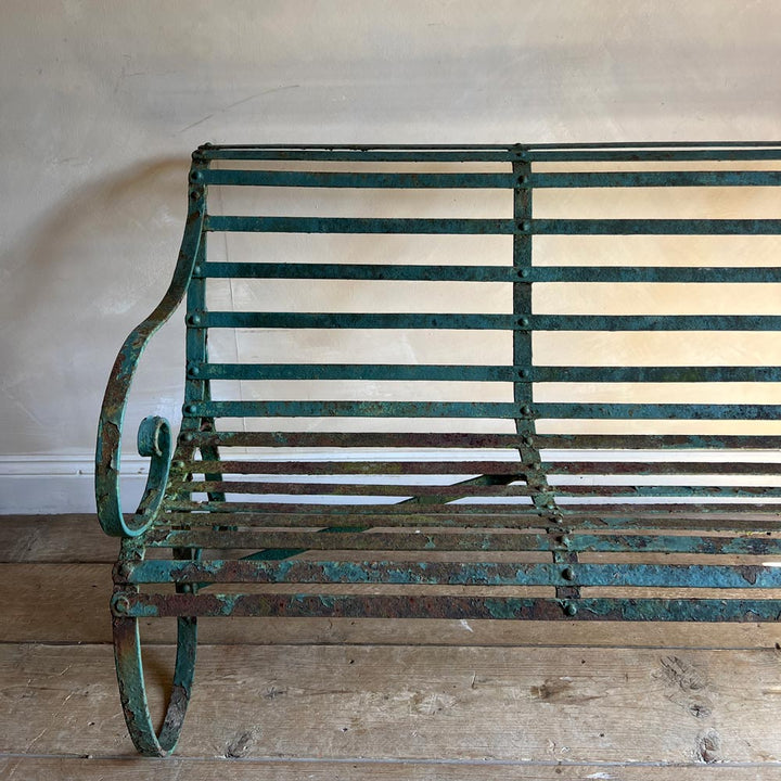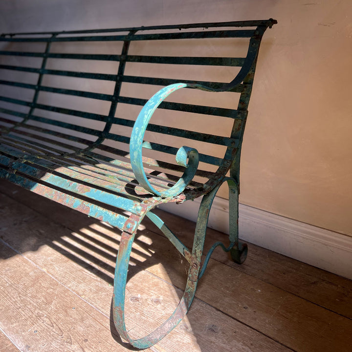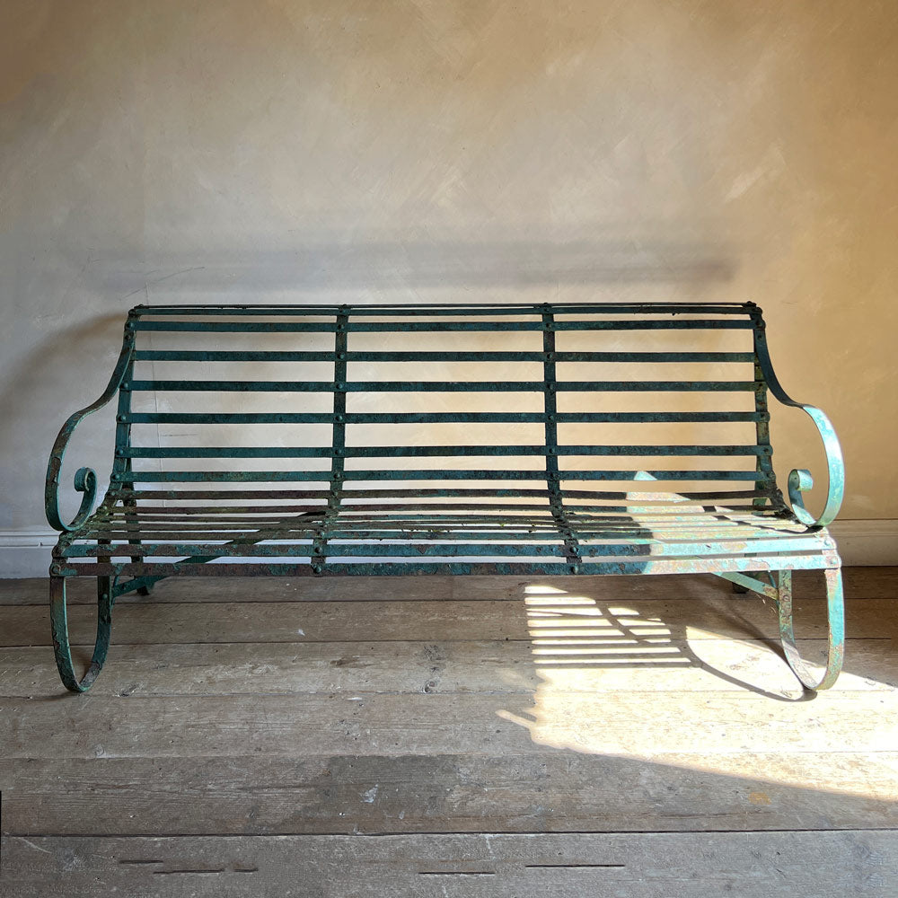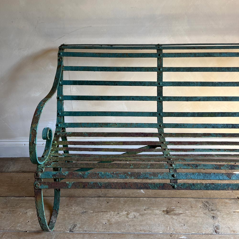 A mid-19th century wrought iron strapwork three-seater garden bench.