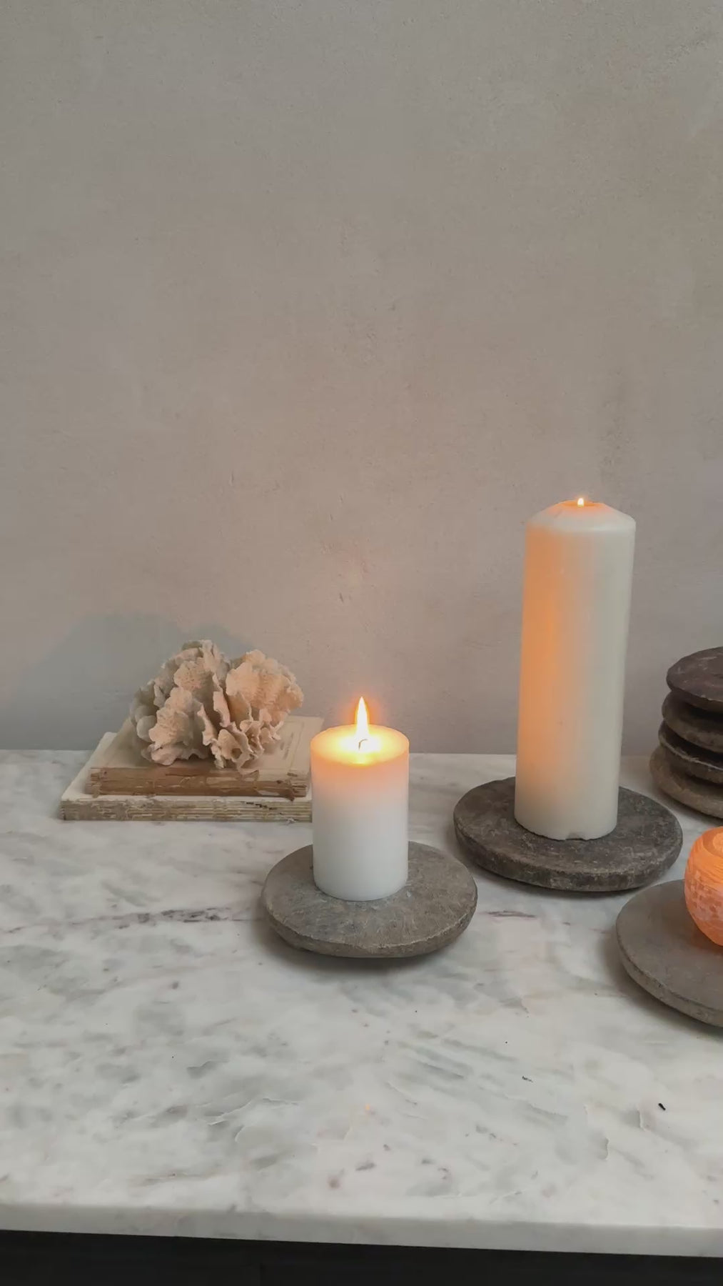 We love to add just one church pillar candle to our stone plates, this looks simple and very stylish.