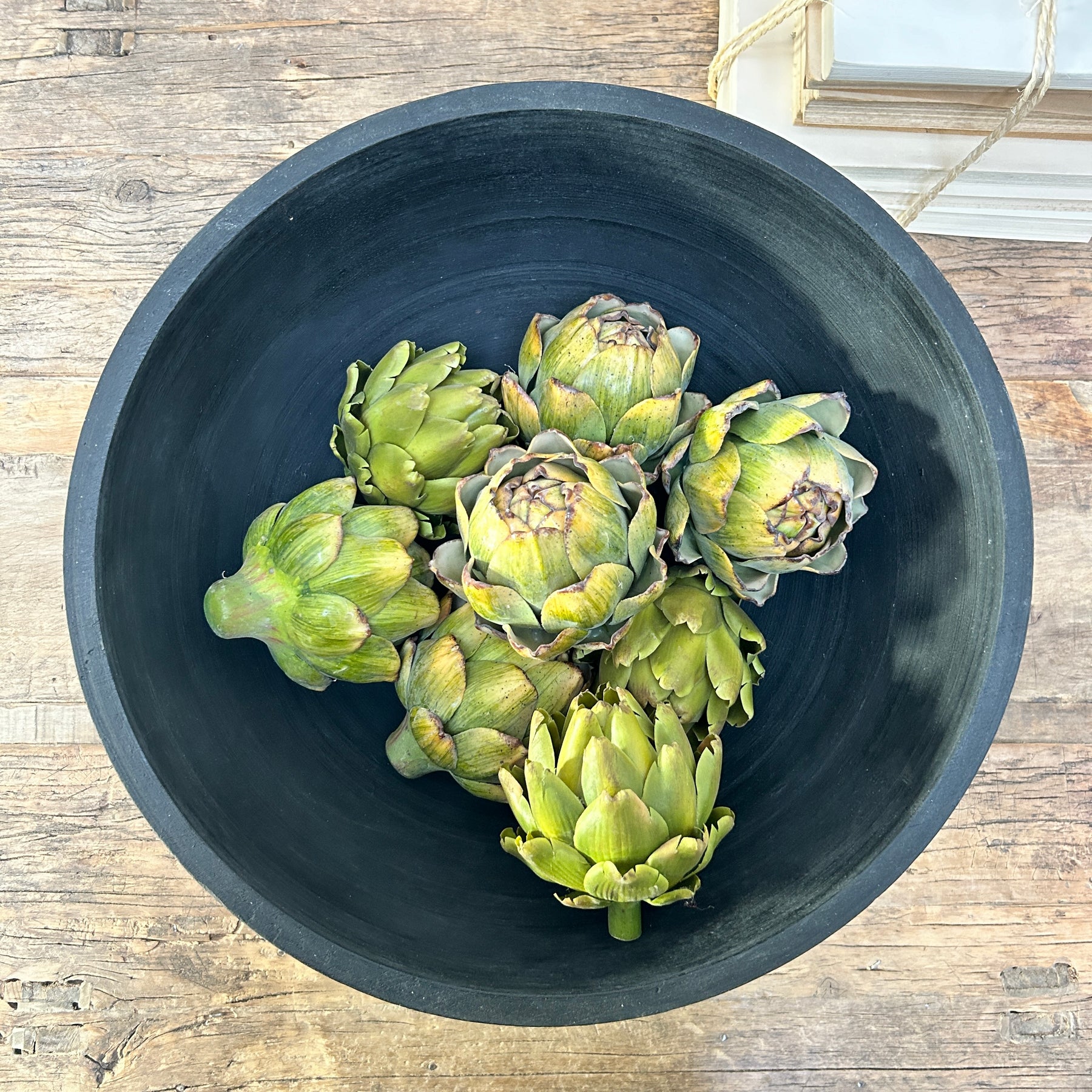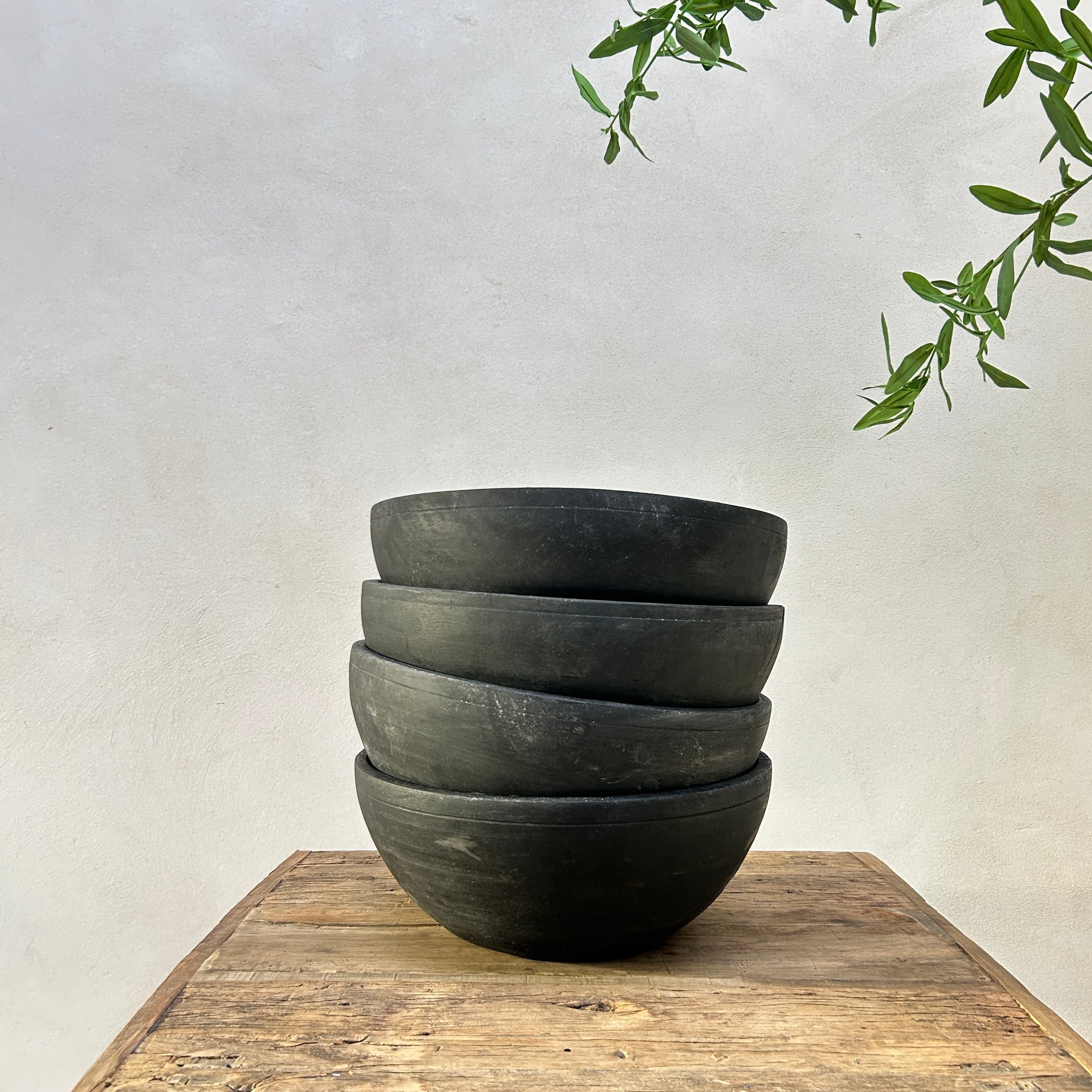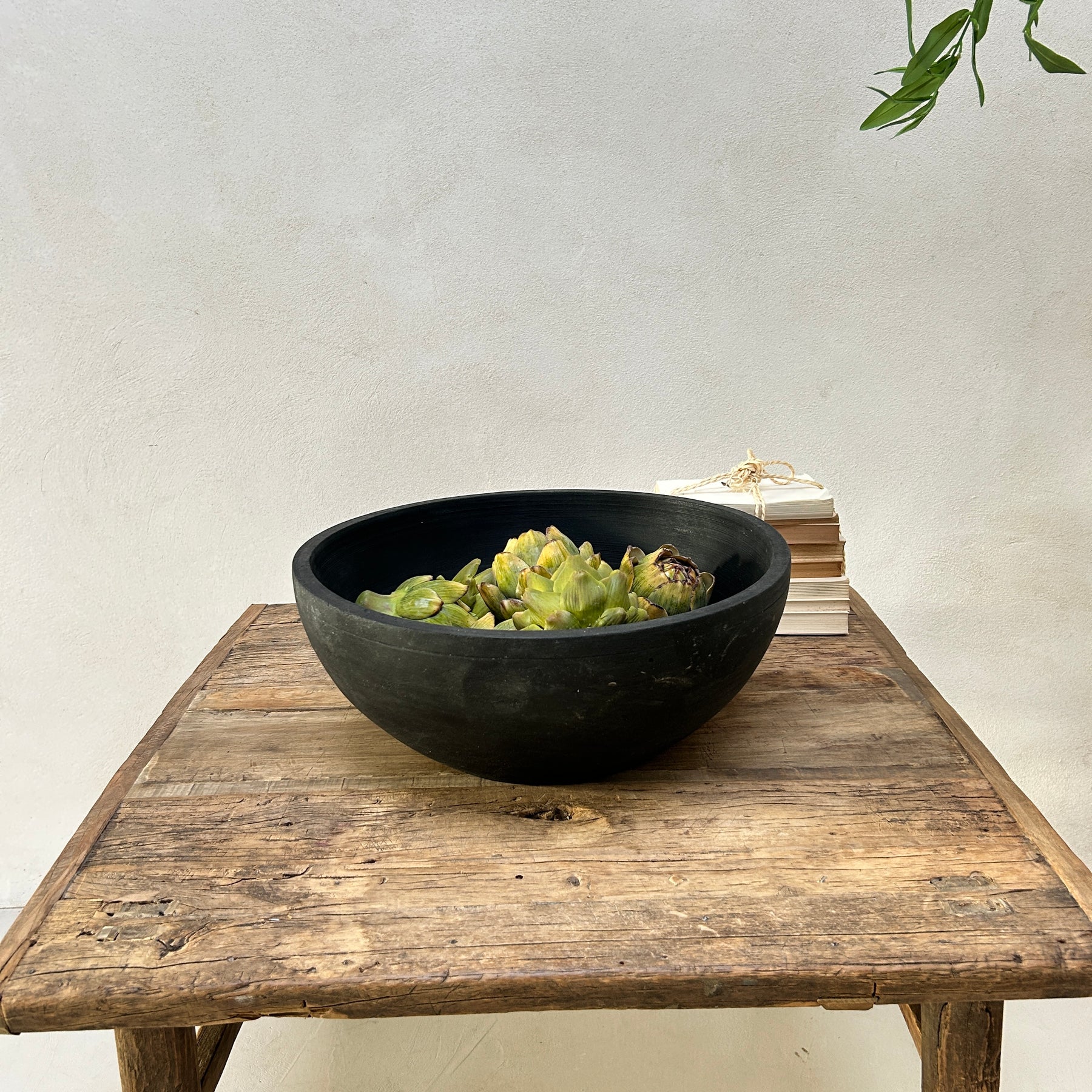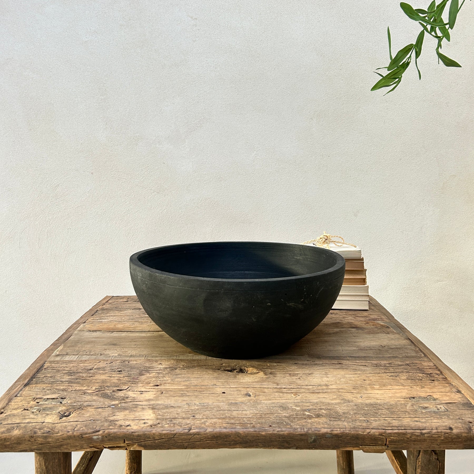 This impressive large wooden bowl originates from Indonesia and is newly made. Hand-carved from a single piece of hardwood and finished in a rich, deep black patina, it embodies both utility and timeless aesthetic appeal.