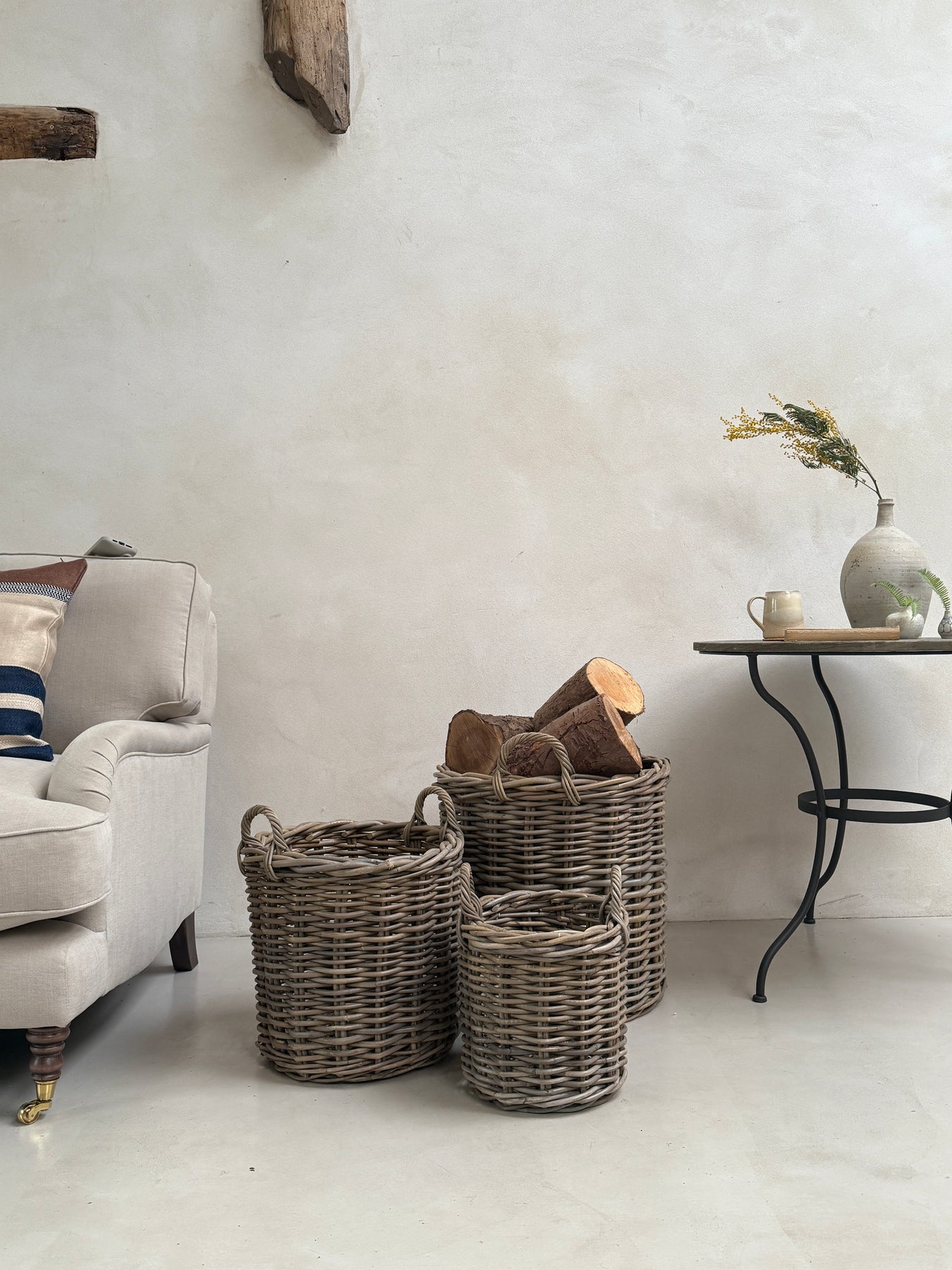 Expertly crafted round log baskets designed to keep your firewood organised and accessible. These sturdy baskets combine practical functionality with rustic charm, making them an essential addition to any fireplace or wood-burning stove setup. Constructed to withstand the weight of logs whilst maintaining their shape, they feature a spacious round design that maximises storage capacity. Perfect for indoor or covered outdoor spaces, these baskets help protect your logs from moisture whilst keeping them neatly contained. The classic round silhouette complements traditional and contemporary interiors alike, transforming necessary firewood storage into a stylish home accessory. Ideal for both regular use and seasonal storage.