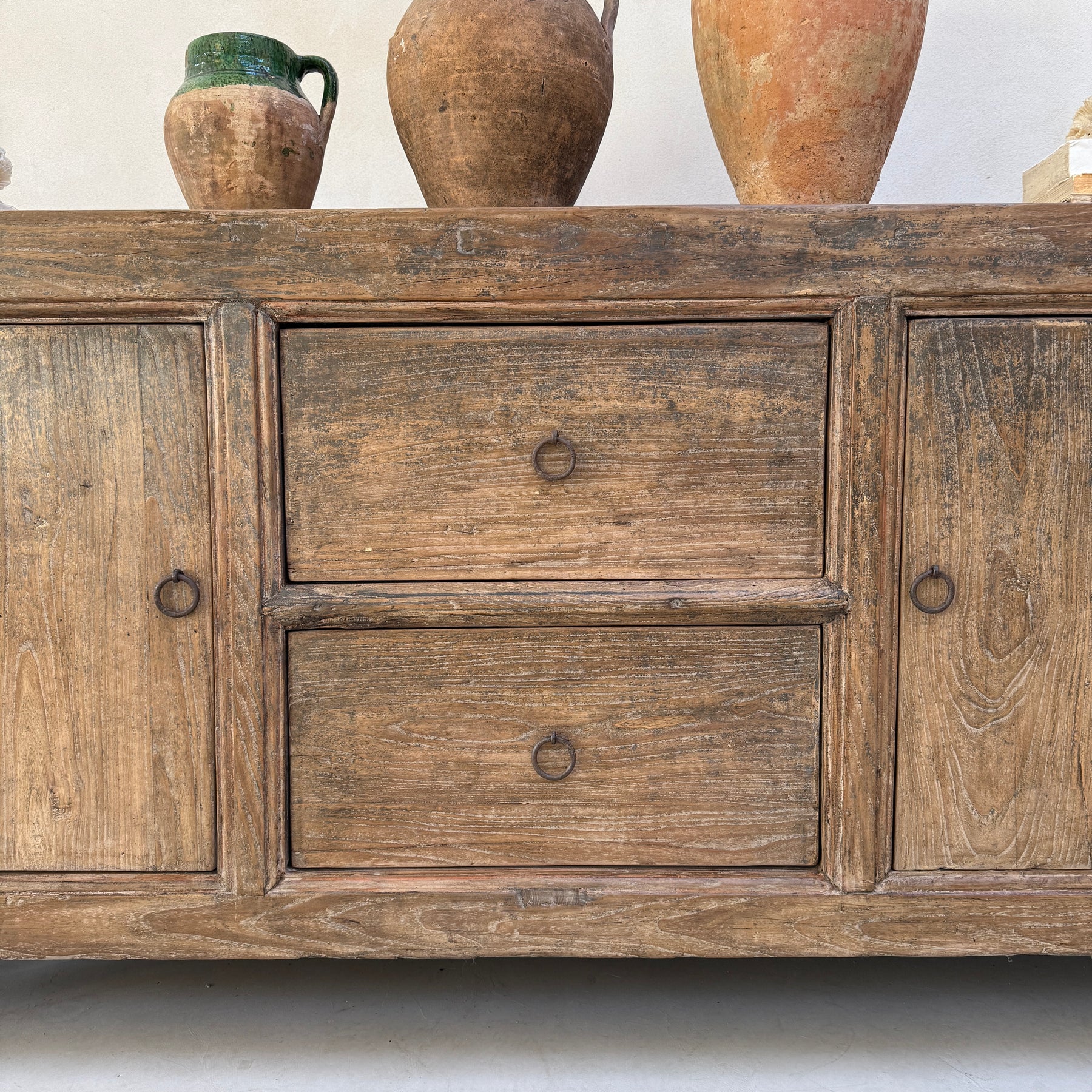 Our antique elm sideboard Harvard is a truly beautiful piece. An original antique, that has been adapted from a large antique grain chest with newly made drawers and shelves, it is crafted from solid elm timbers and has a fabulous weather worn patina. This cupboard is a fabulous size with bags of storage, with useful drawers and internal shelves. A perfect solution for storing many items within the home.