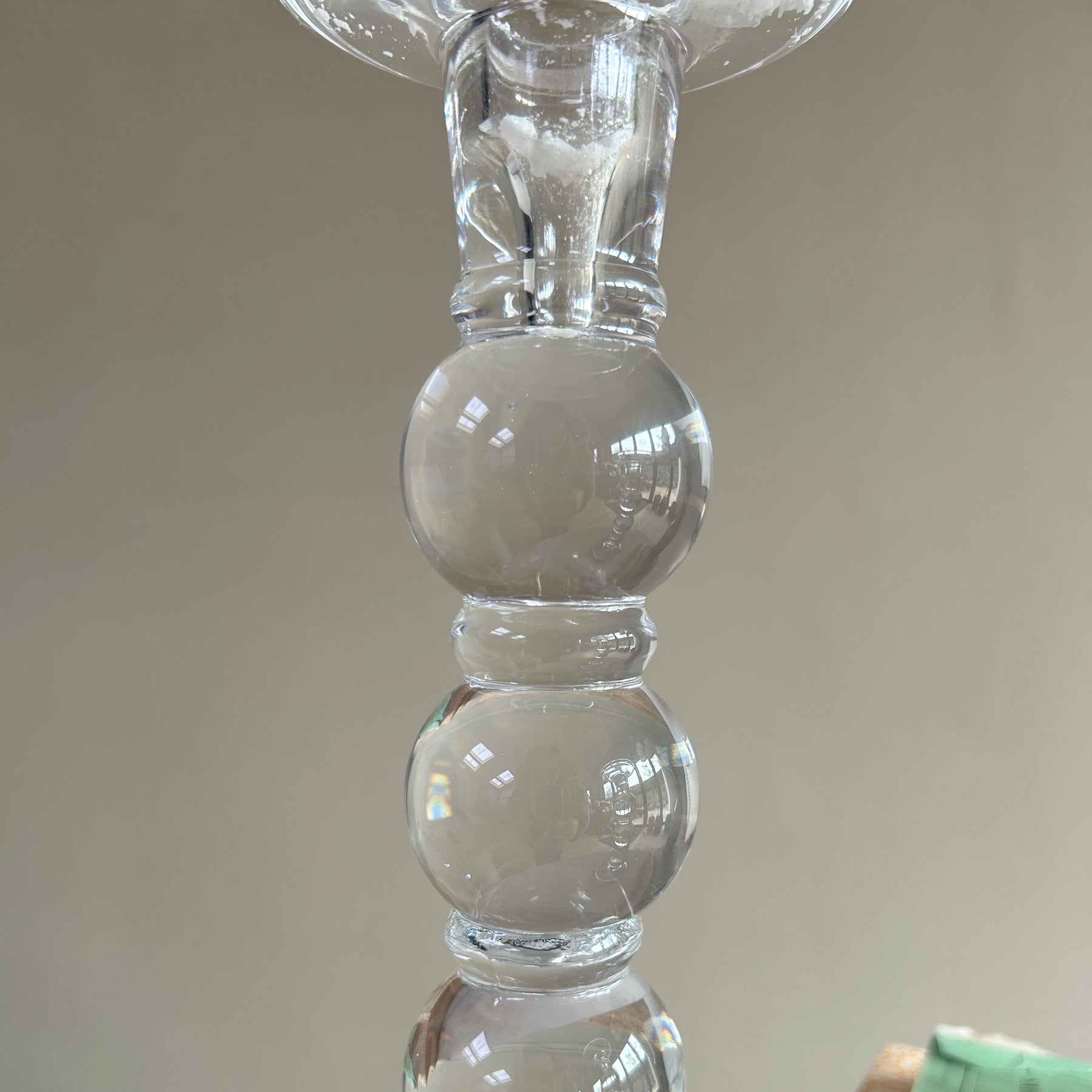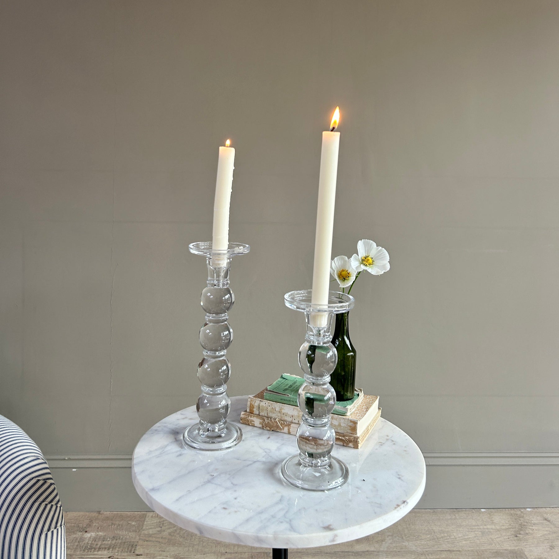 These simply stunning clear glass bobbin candle holders are wonderfully weighted. Their simple bobbin design will add a little understated luxury to any dining table setting.