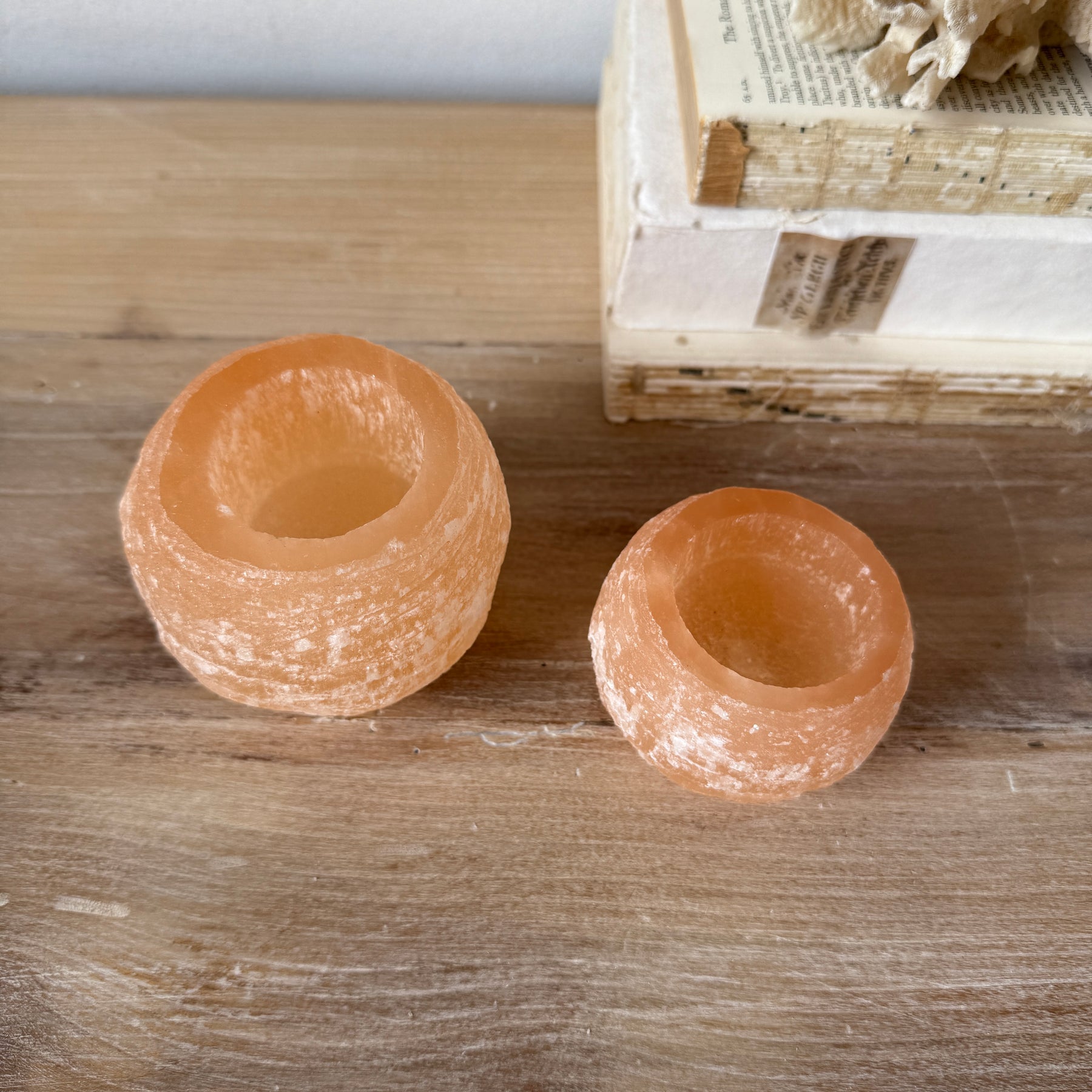 A stunning small tealight holder, crafted from the natural translucent crystal Selenite.