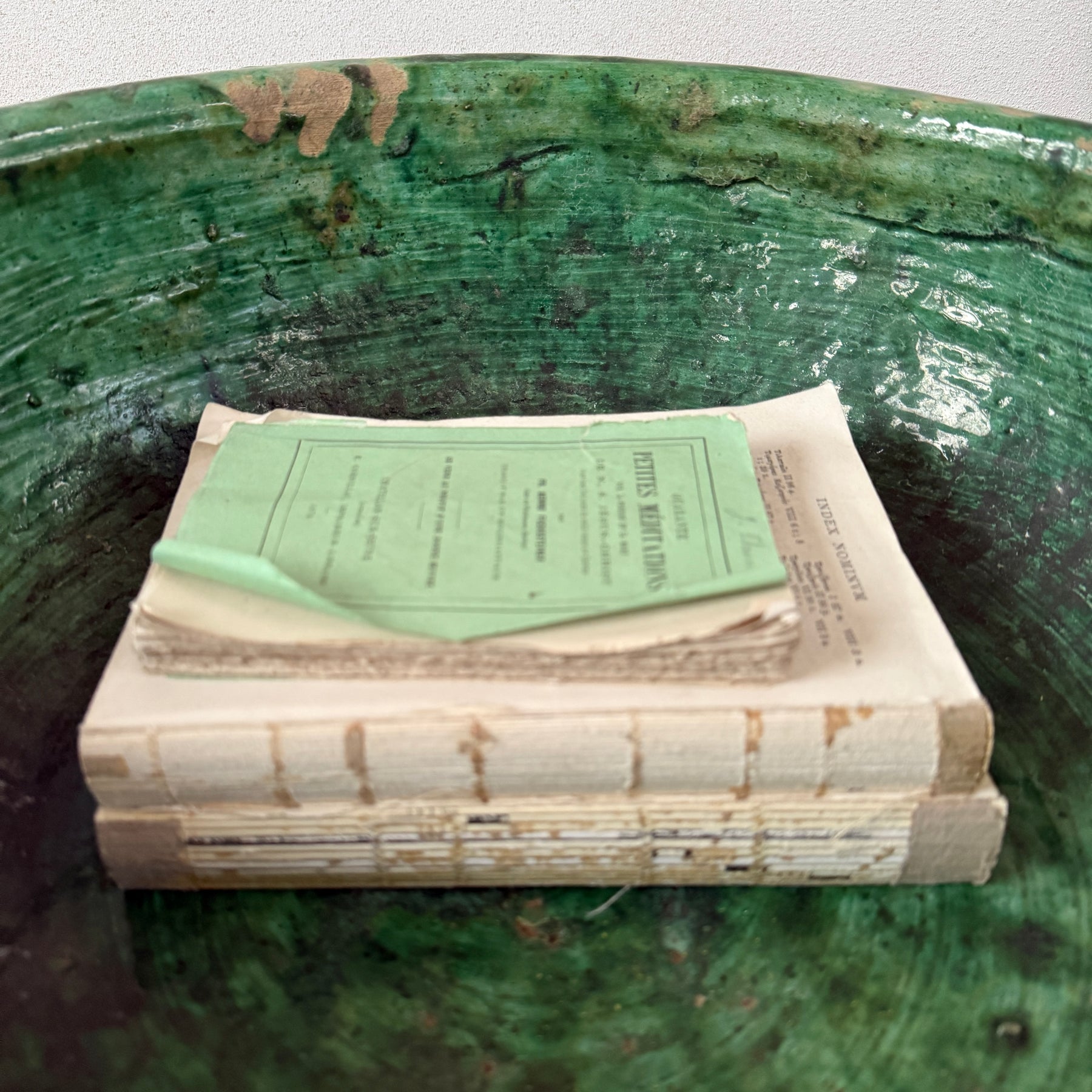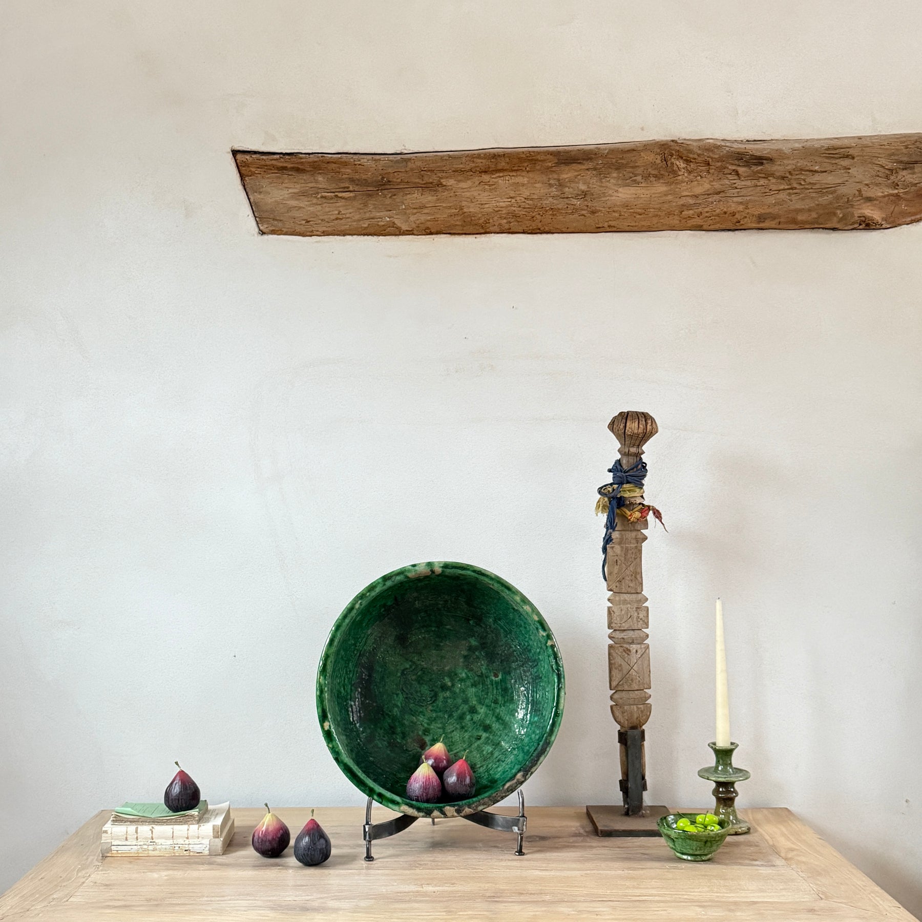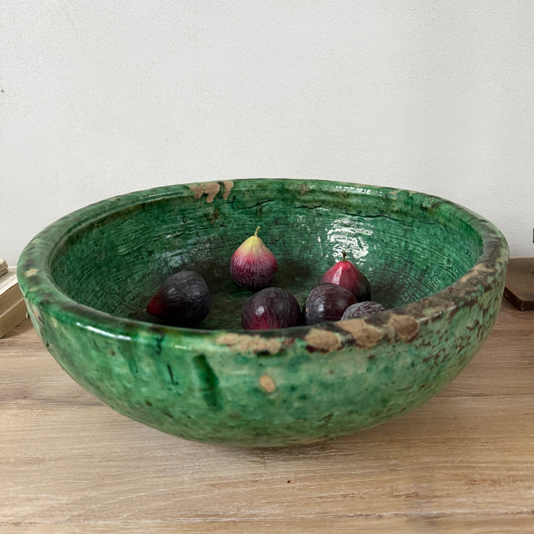 This stunning very large piece of hand made pottery exemplifies traditional Moroccan craftsmanship, featuring the characteristic half-glazed finish and vibrant green hues of pottery from the village of Tamegroute.