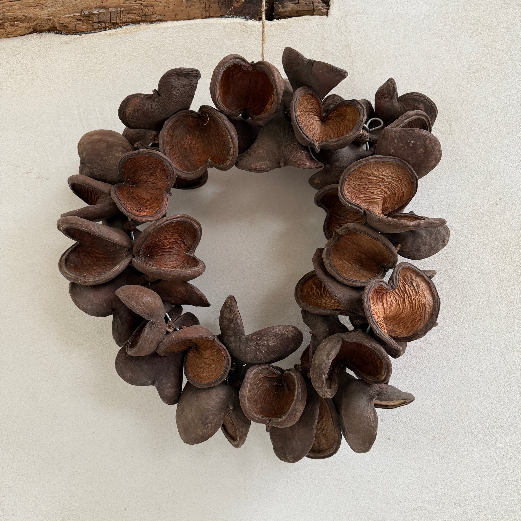 Made from the emtpy seed pots of the almond nut our fabulous wreath is perfect year round for the front door or mantlepice.