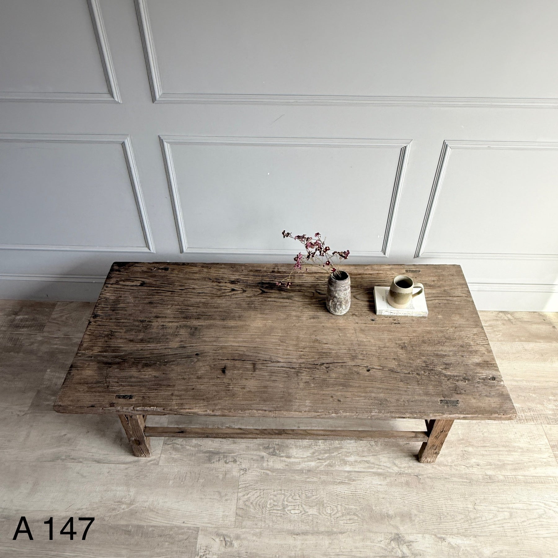 Each unique antique table is crafted from ancient elm or old pine, dating back over a century.