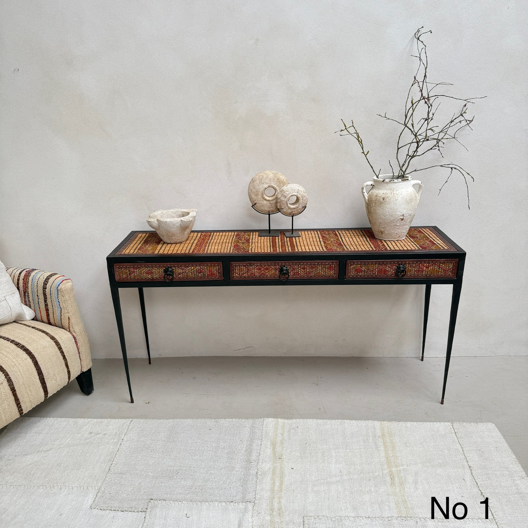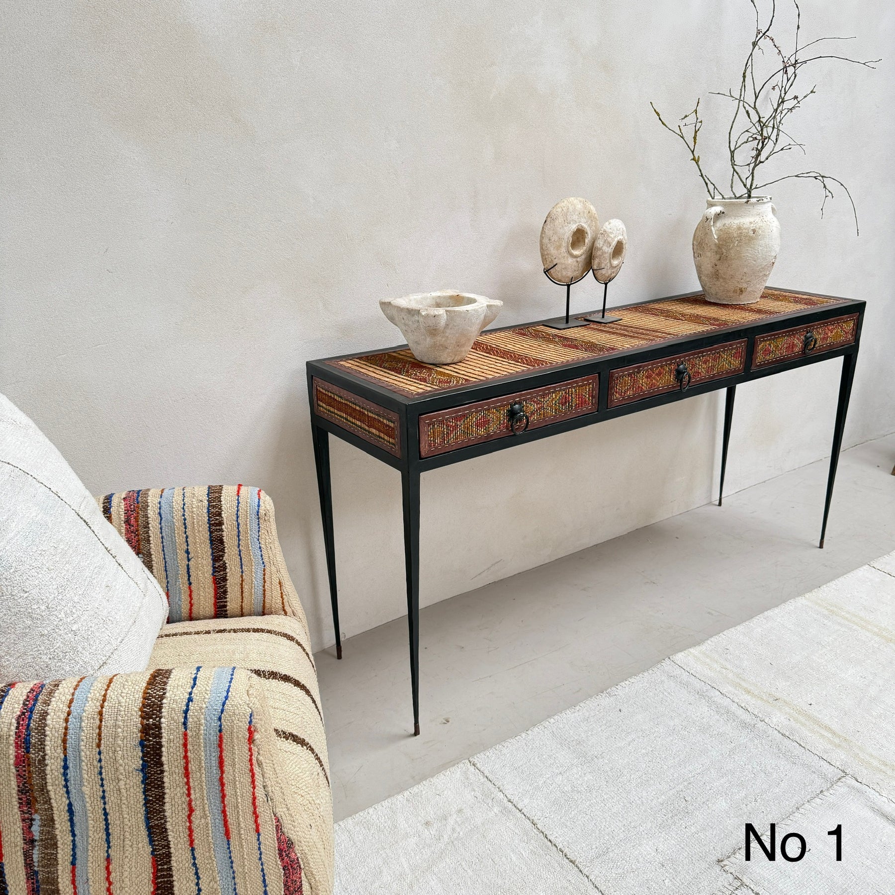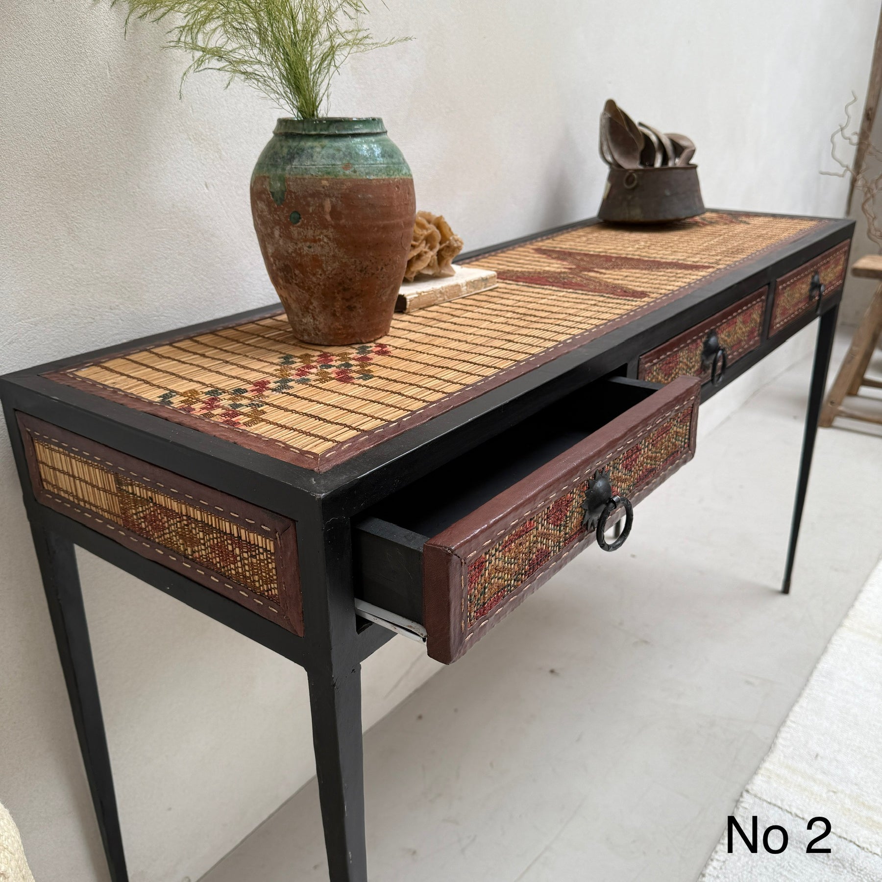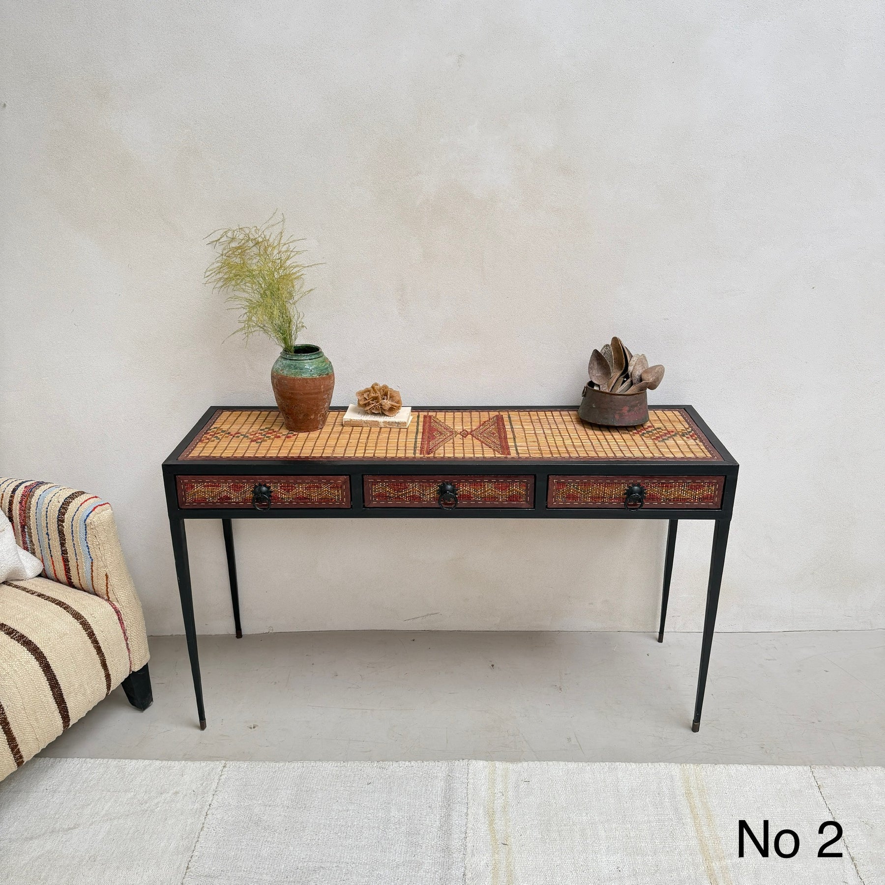This unique 3-drawer console table is made from a handwoven Berber Moroccan Touareg floor mat. This expertly crafted console table is newly made and showcases the stunning vintage textiles that were once originally North African Touareg rugs. Traditionally handwoven from reeds, the dried fibres are finely split into small strips and the surface is reminiscent of very small slats of wood.