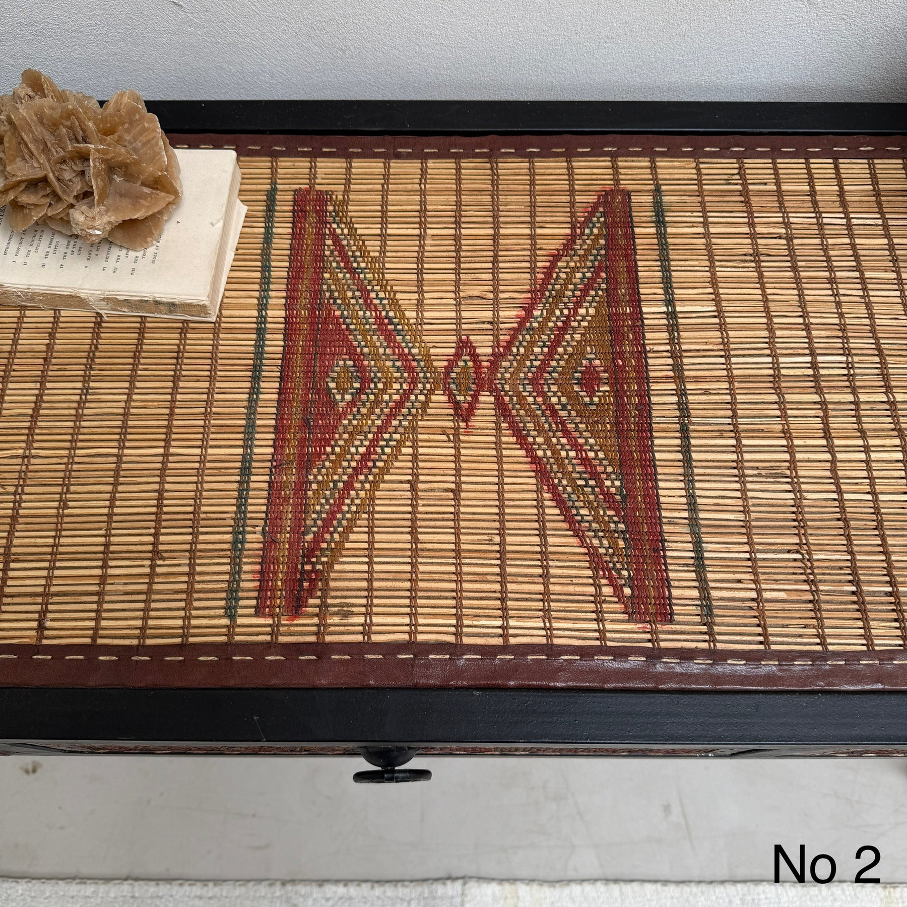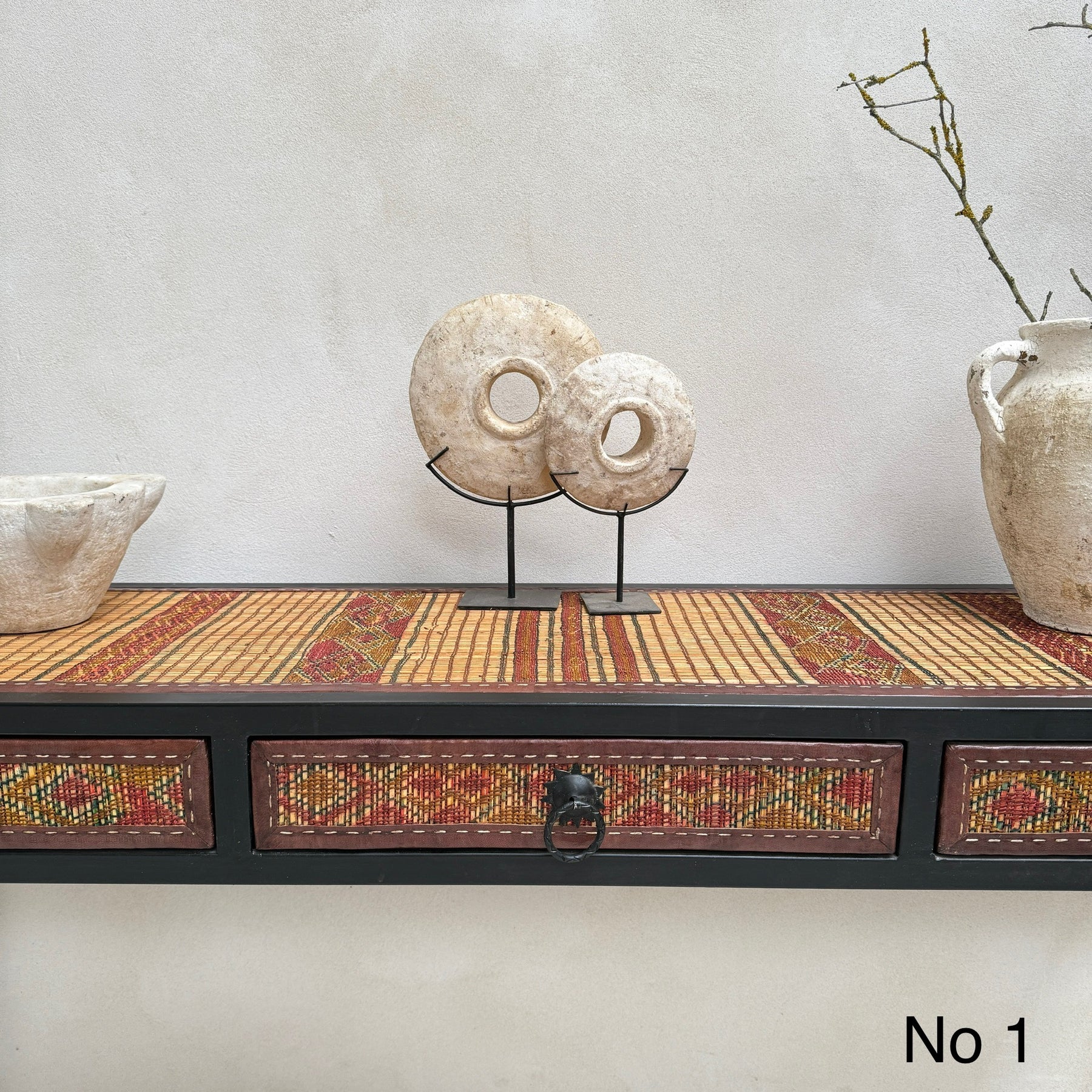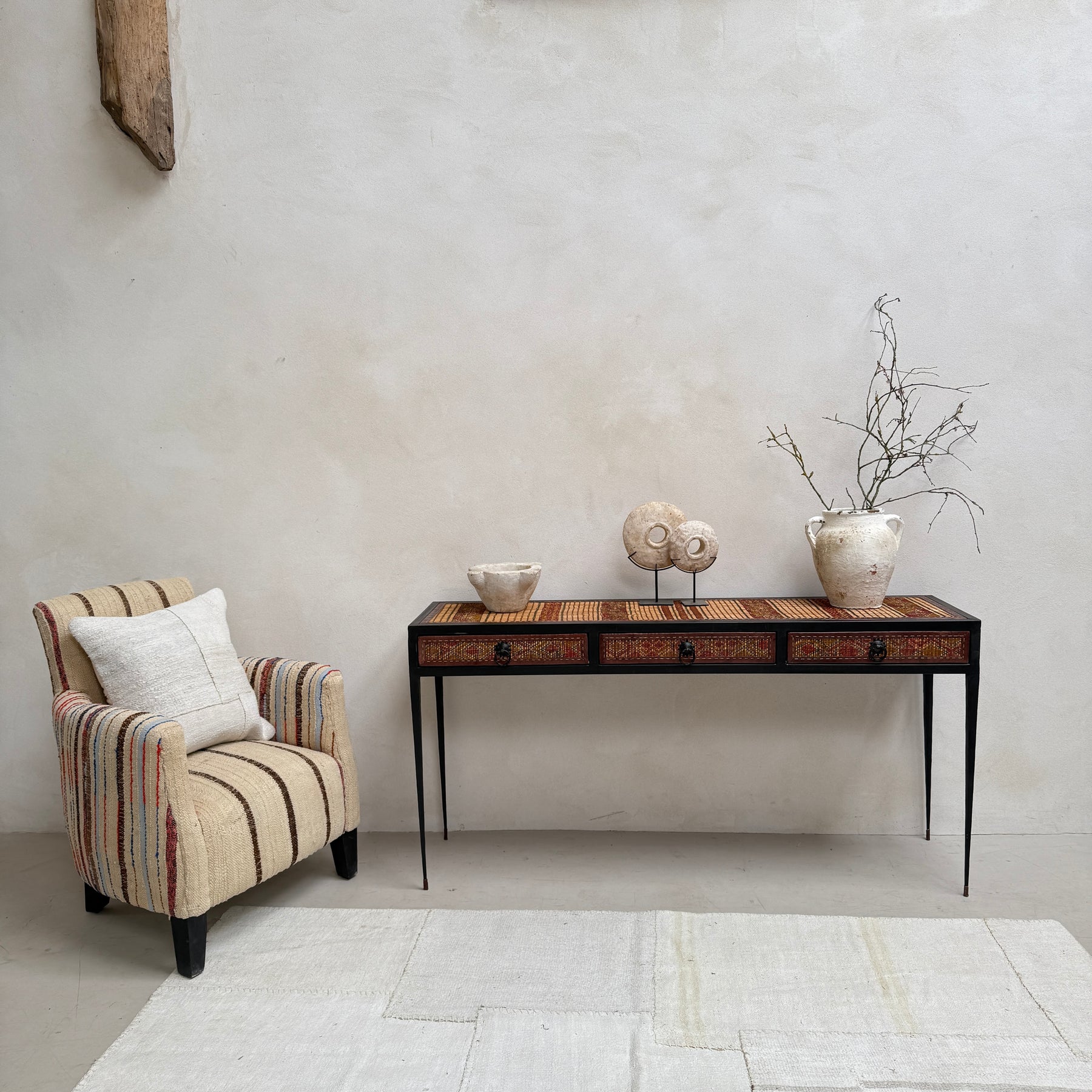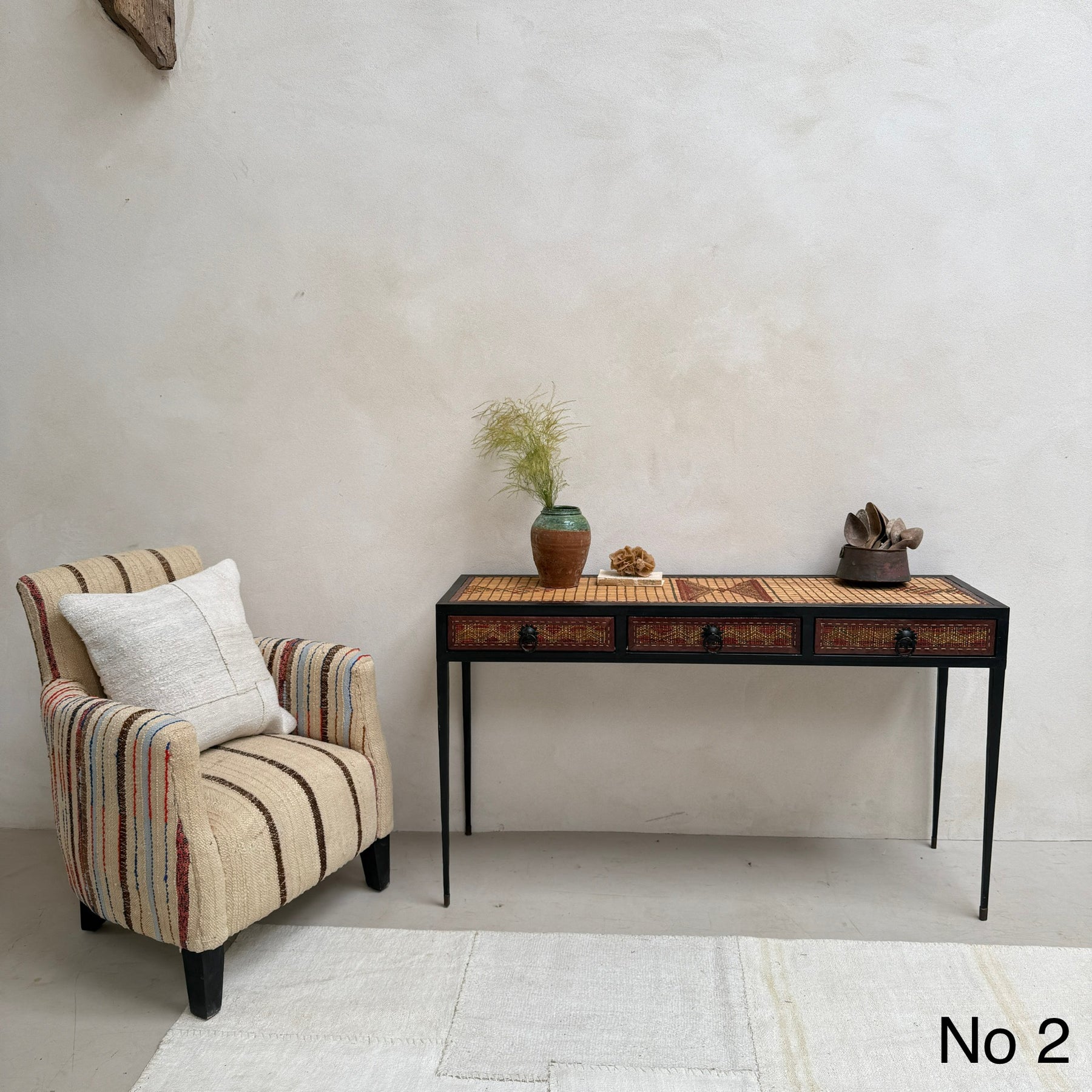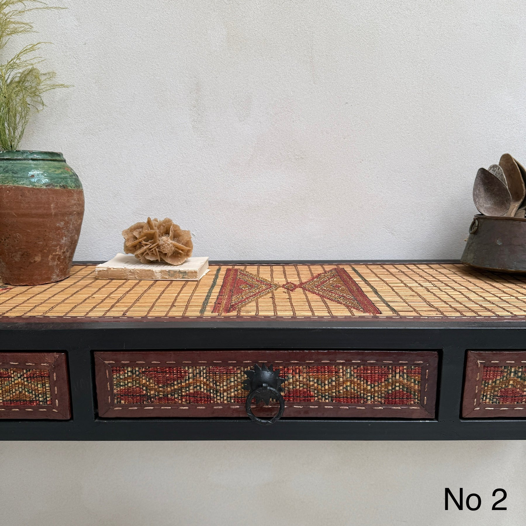 This unique 3-drawer console table is made from a handwoven Berber Moroccan Touareg floor mat. This expertly crafted console table is newly made and showcases the stunning vintage textiles that were once originally North African Touareg rugs. Traditionally handwoven from reeds, the dried fibres are finely split into small strips and the surface is reminiscent of very small slats of wood.