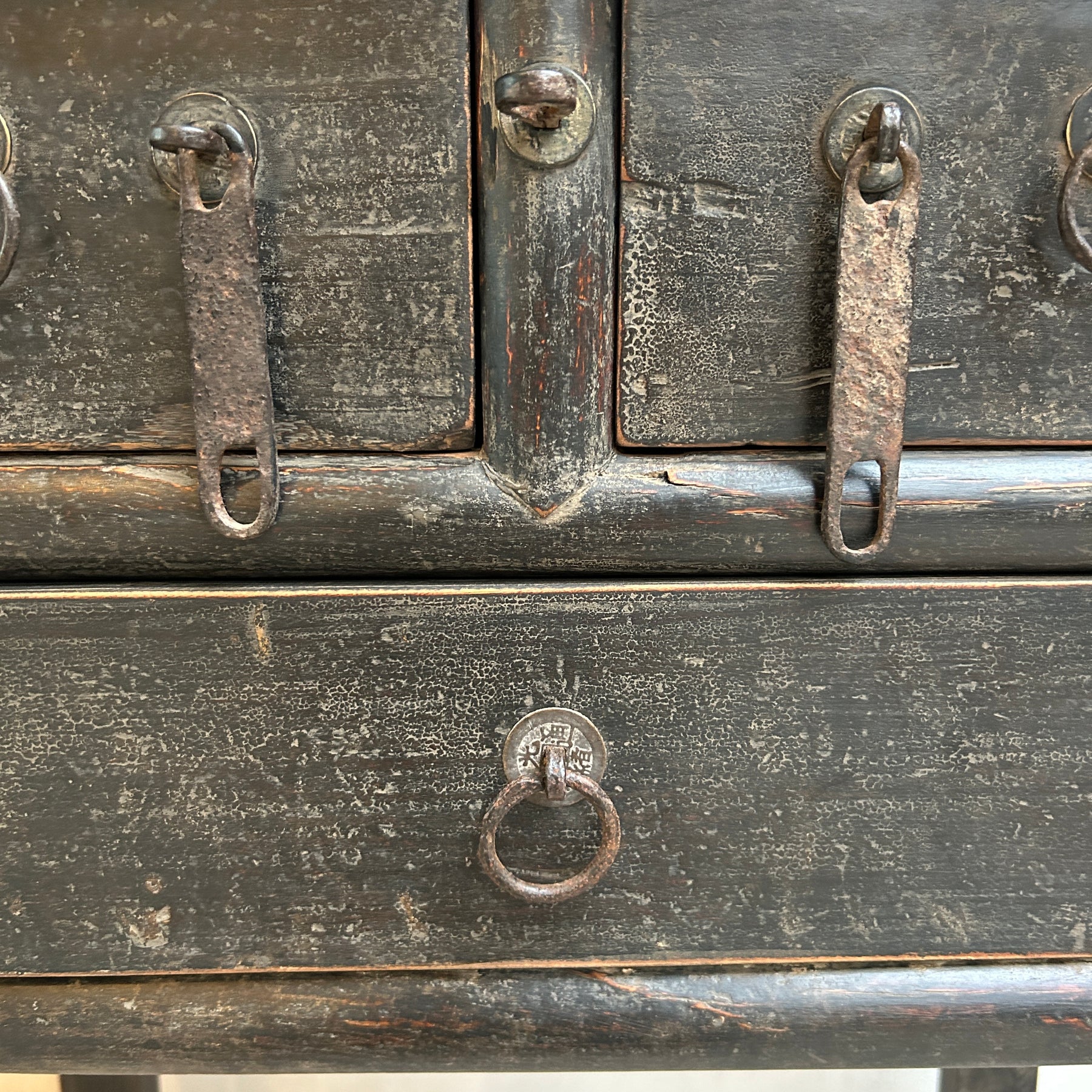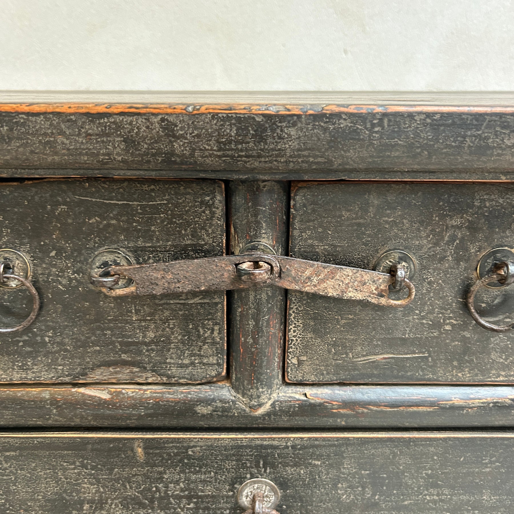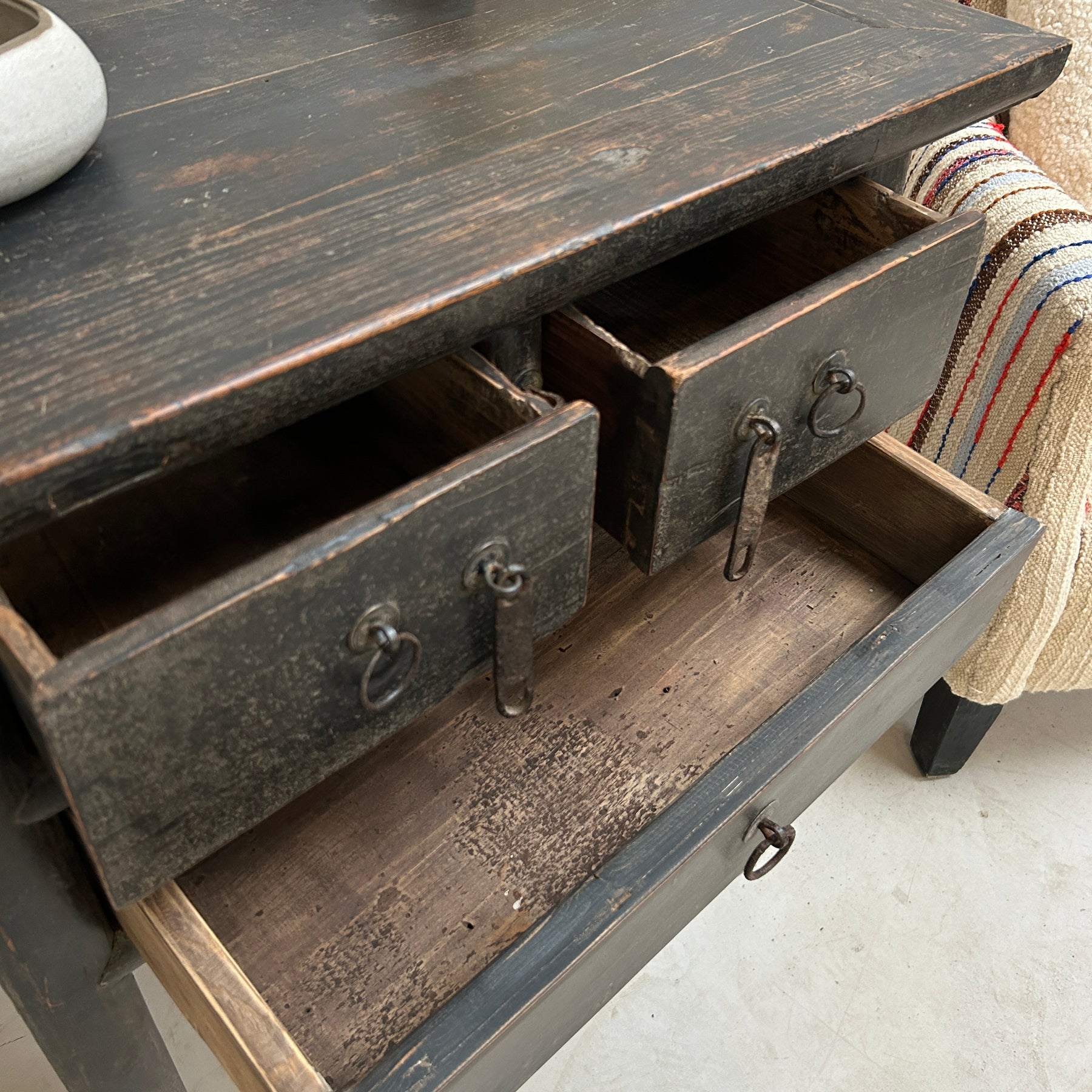 Elevate your living space with our small antique black console table Shere, a stunning solid wood console offering functional storage with three useful drawers.