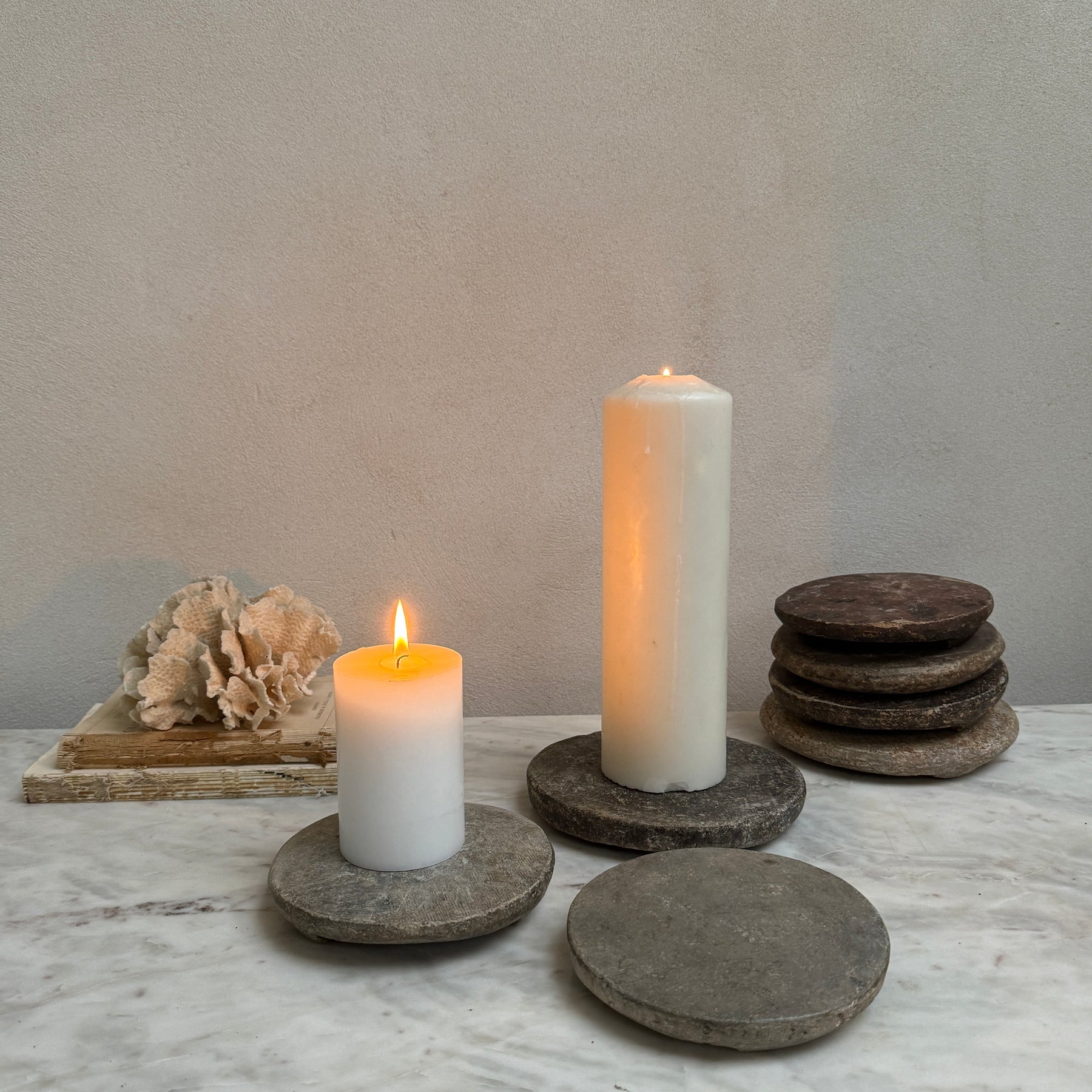 We love to add just one church pillar candle to our stone plates, this looks simple and very stylish.