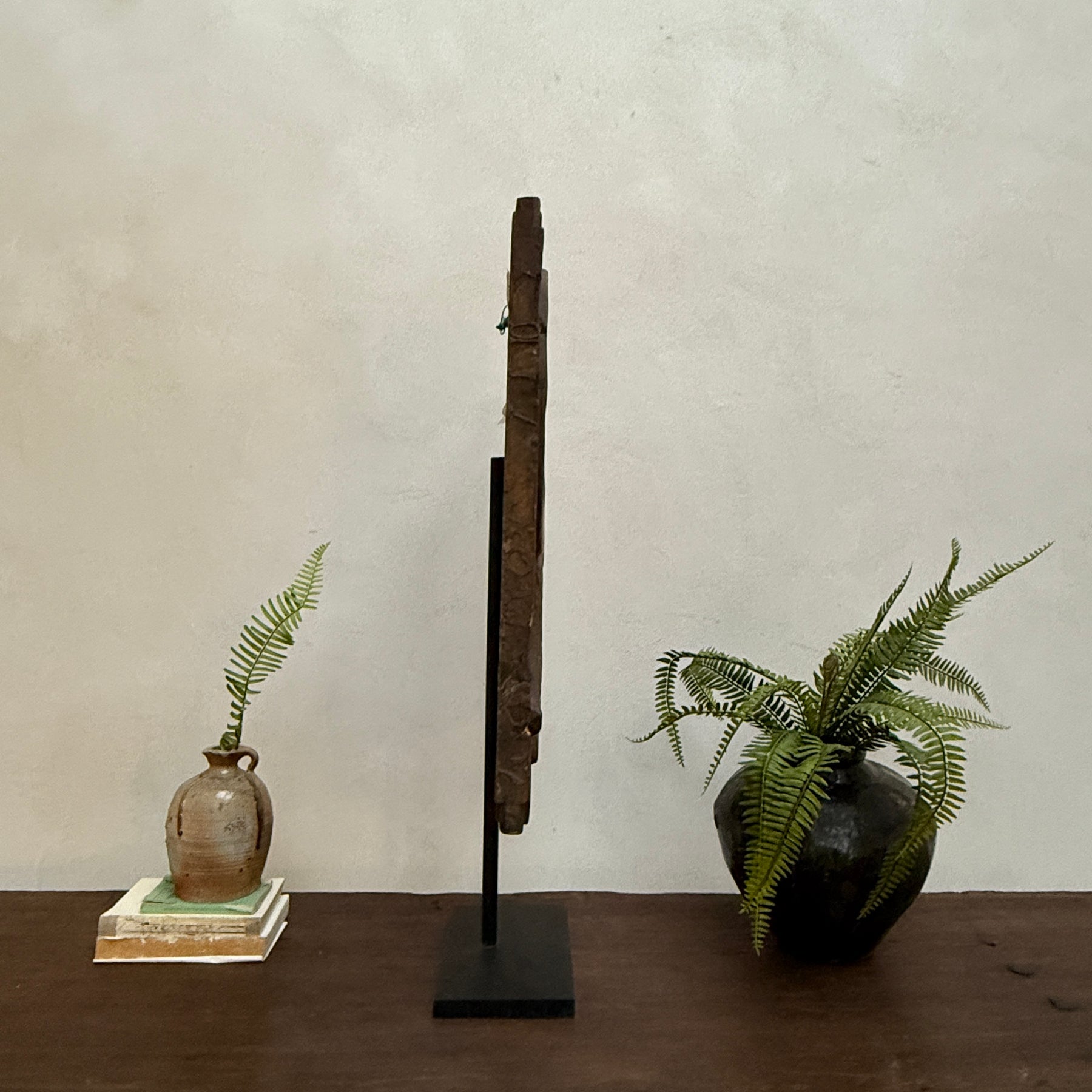 With fantastic texture and surface interest this unique artwork is mounted onto a bespoke black iron stand. The perfect piece for adding unique interest to a display on a console table, sideboard or window sill.