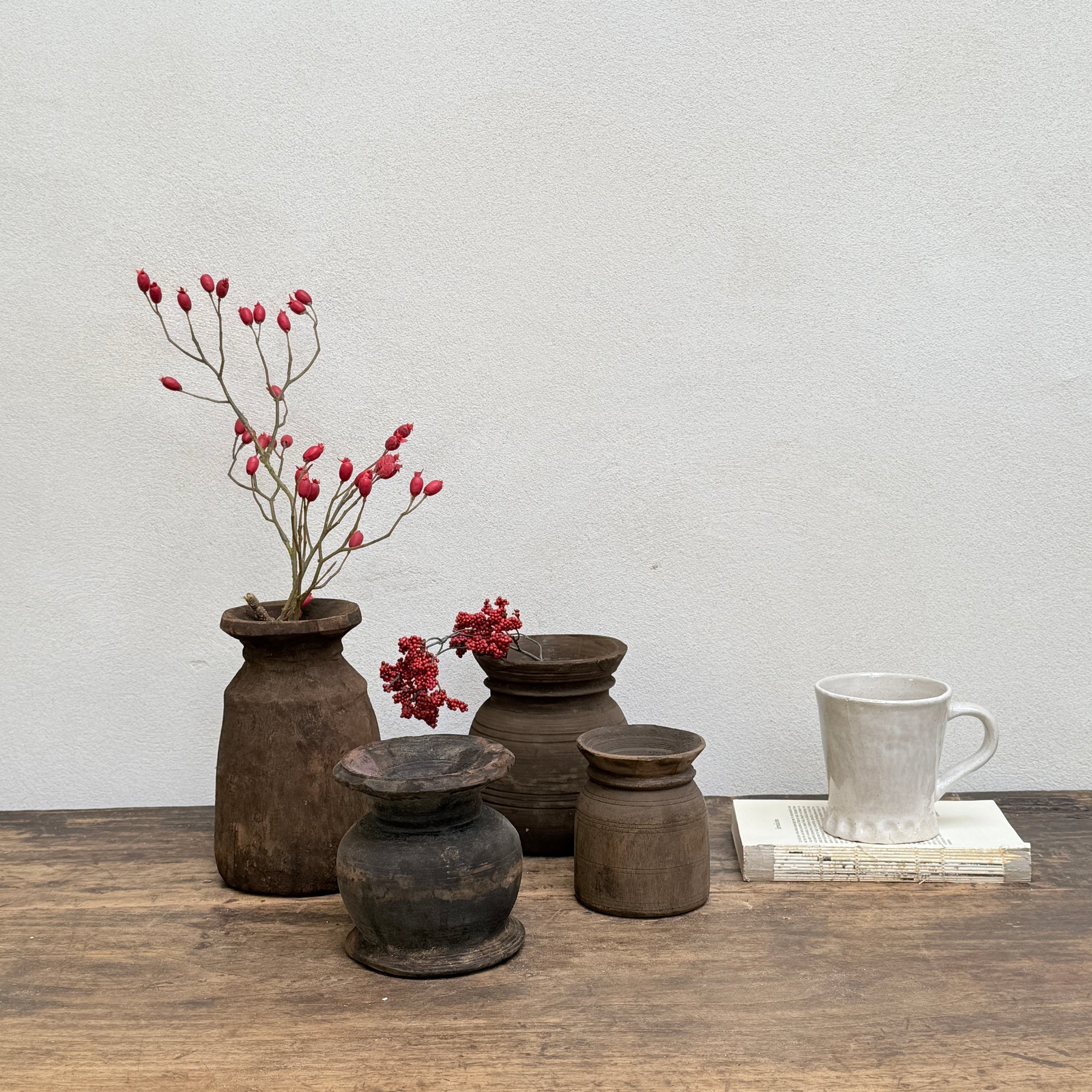 These wonderfully unique antique Nepalese wooden pots are the perfect antique home accessory. They would look beautiful grouped together as a statement display on a sideboard, console table or shelf. Stunning simply left empty, they are also the perfect vessels for displaying dried blooms or stems.