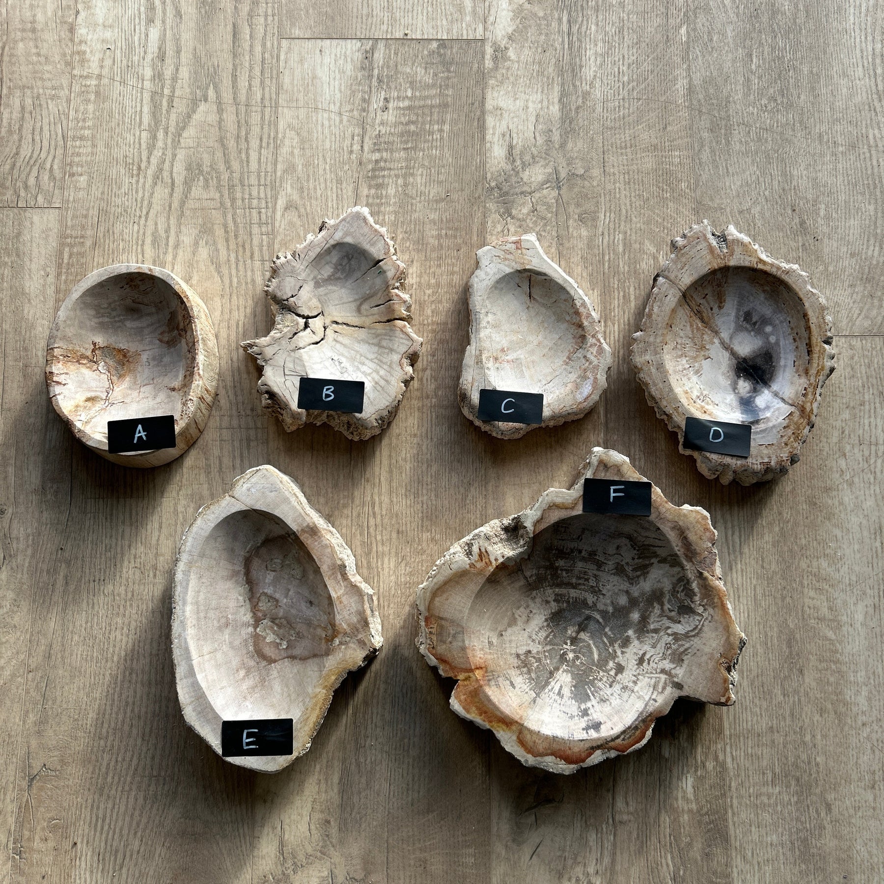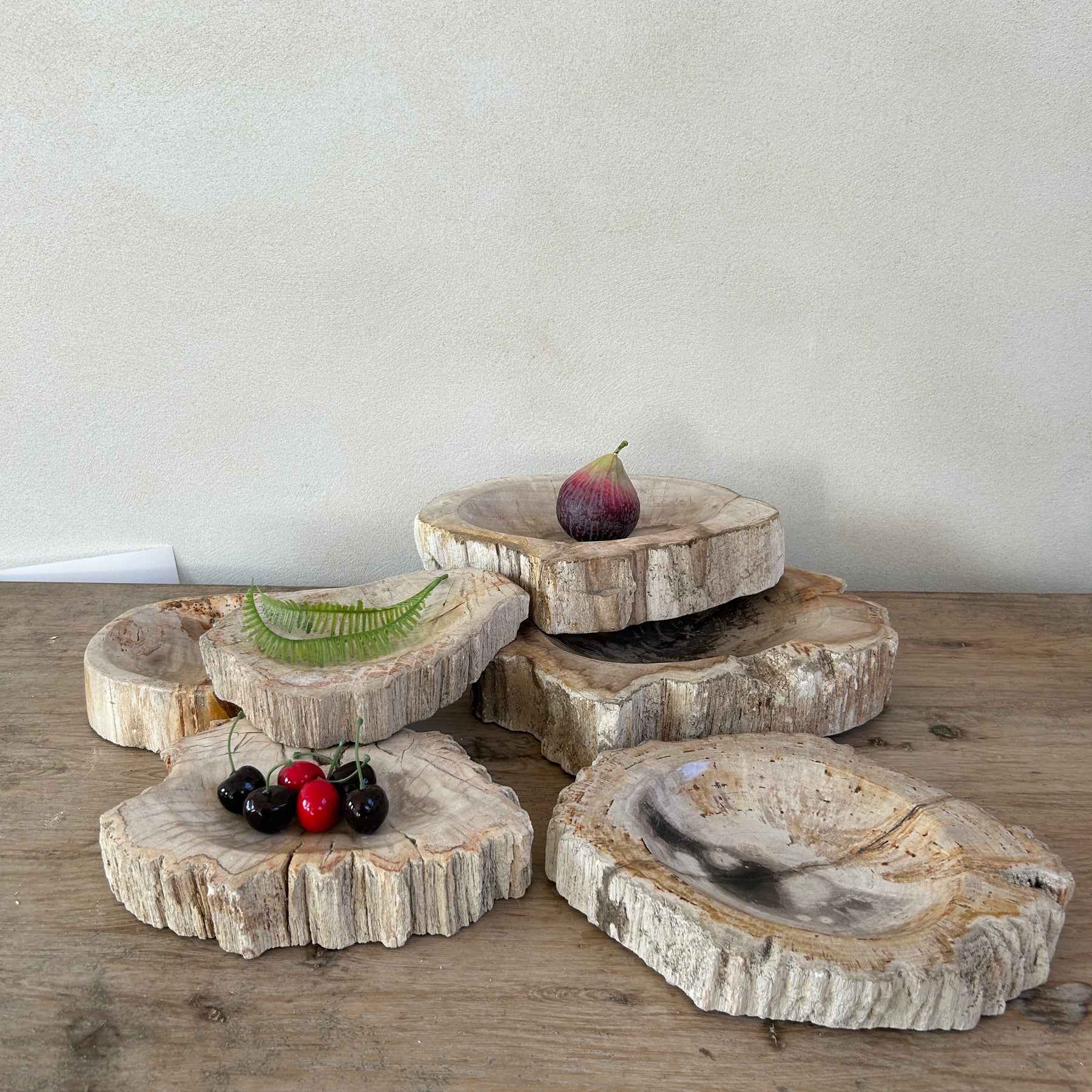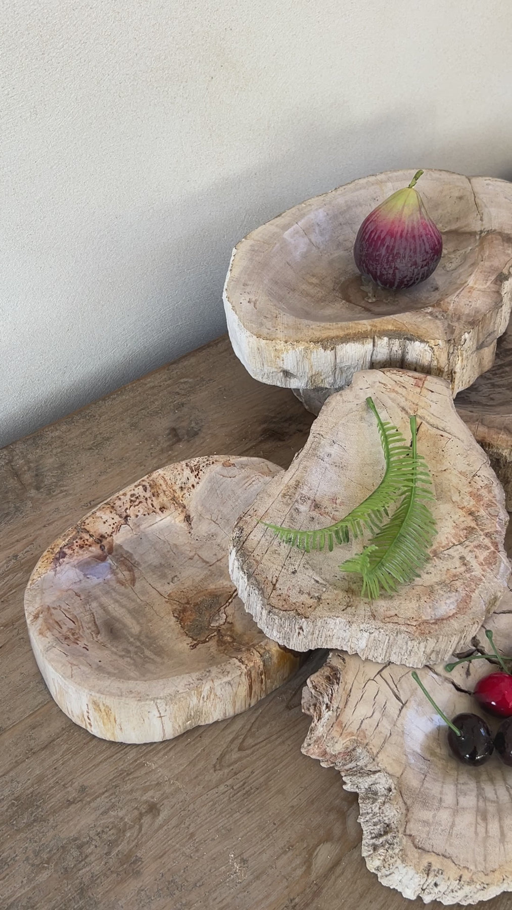 These petrified wood bowls began life as living trees, slowly transformed over millions of years into stone. As the wood fossilised, the organic structure was replaced by minerals, preserving the original rings, knots and grain in incredible detail.