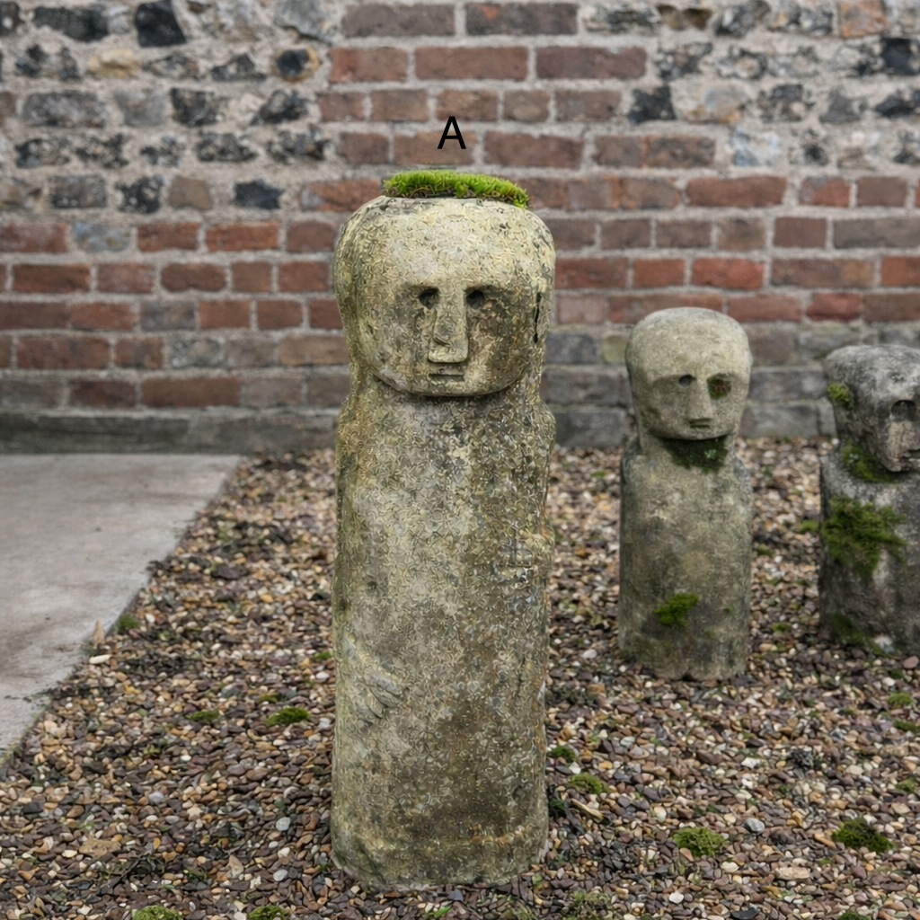 A collection of vintage hand-carved stone statues from the Indonesian island of Sumba, each individually sculpted using traditional tools and techniques. Carved from solid stone, their strong, simplified forms and beautifully weathered surfaces give them a grounded, sculptural presence.