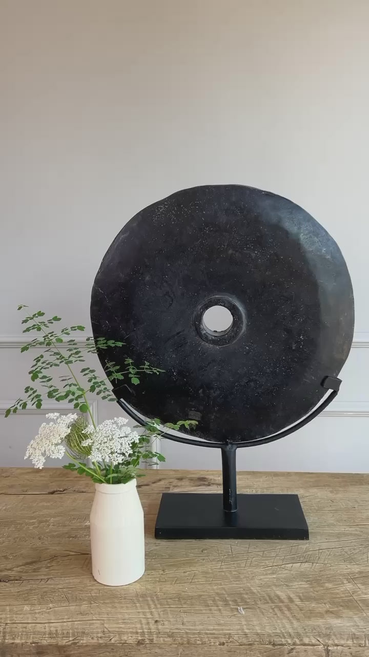 Each of our antique lava stone discs is unique in size and surface patina being made from naturally occuring volcanic stone. Our discs each have a bespoke black iron stand.