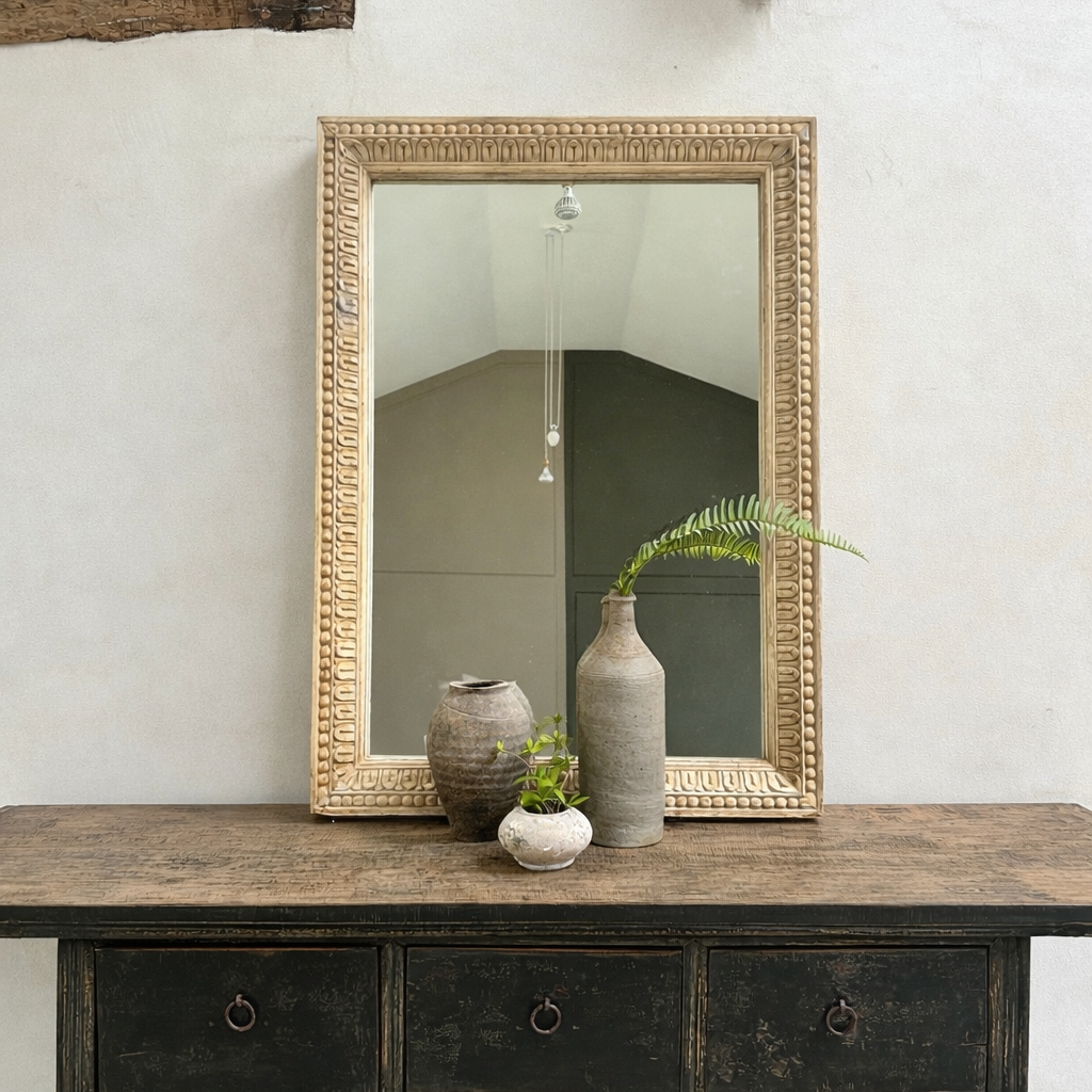 A quietly striking piece, the Eirah mirror is carved by hand from solid wood, with a richly detailed frame that brings depth and texture to any setting. The soft patina and gentle variations in tone reflect its age and craftsmanship, giving it a sense of history that newer pieces simply can’t replicate.