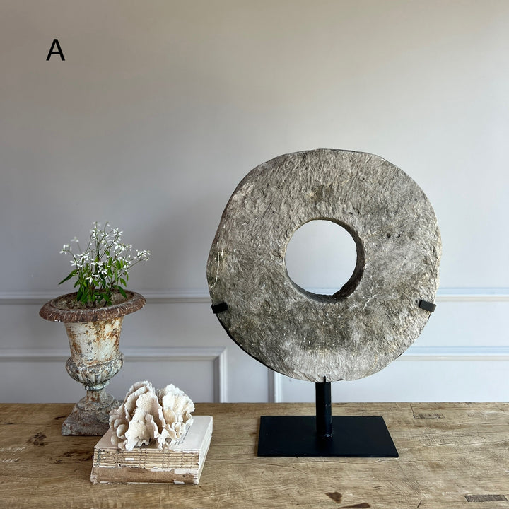 Our gorgeous Antique Millstone Disc on Stand has a fabulous weathered patina that's synonymous with its age. They encapsulate history within their beautiful irregular shape.