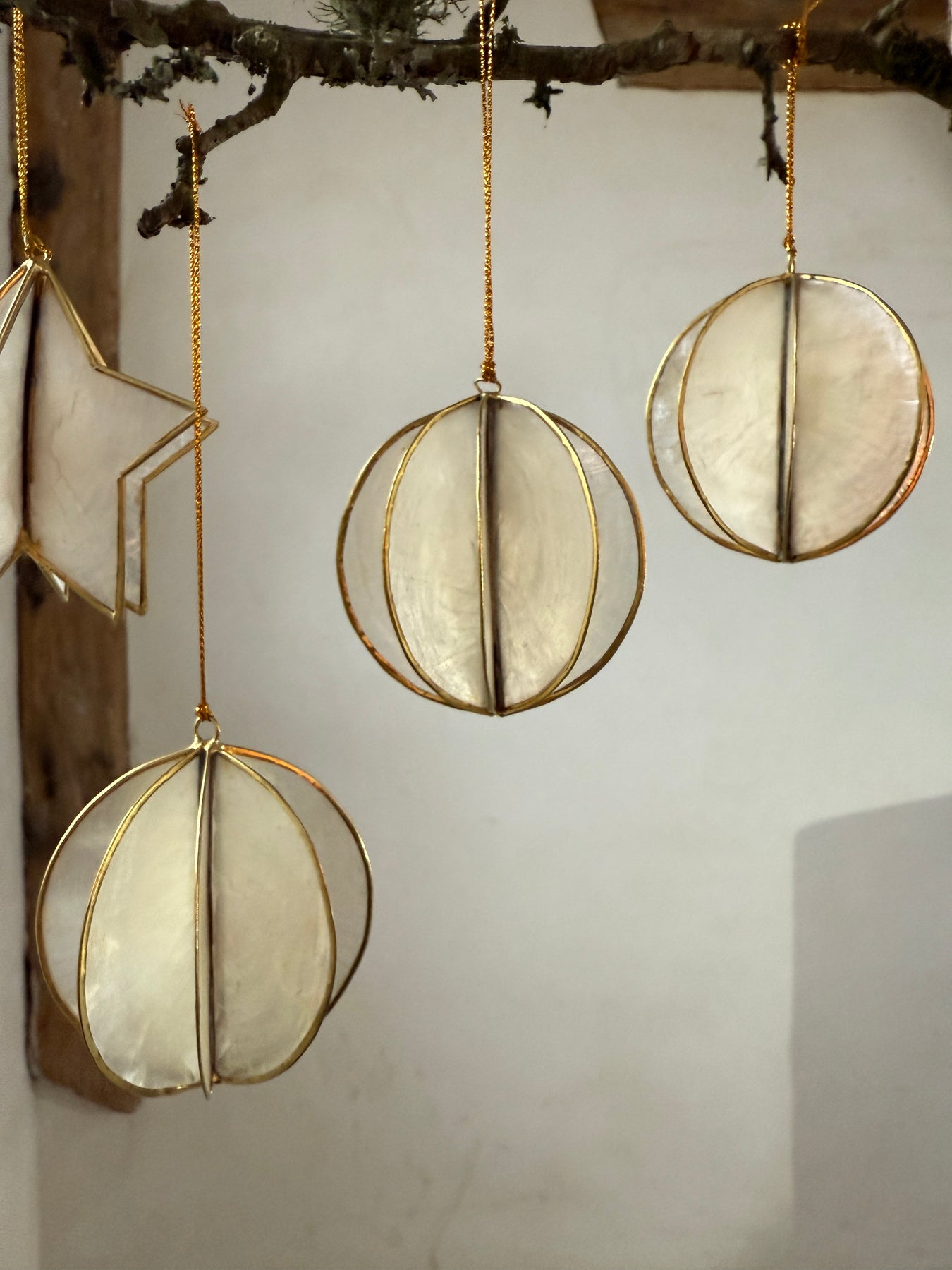 Sustainably made from crushed oyster shells this rigid decoration is made from six sections of pearlescent crushed shell which is opaque and has a slight iridescence to it's surfaces. Framed with brass edges this decoration is robust and yet lighweight.