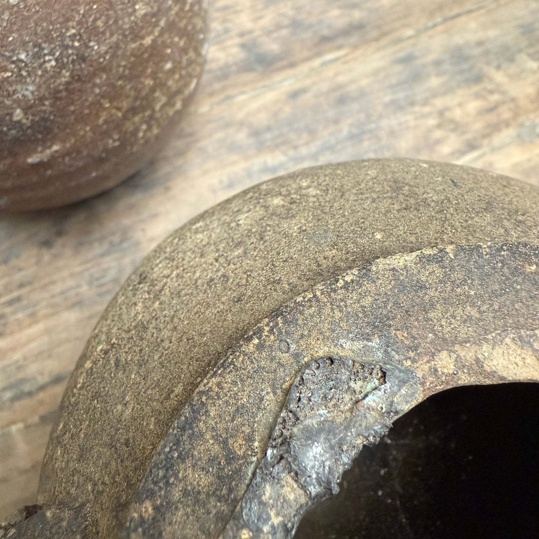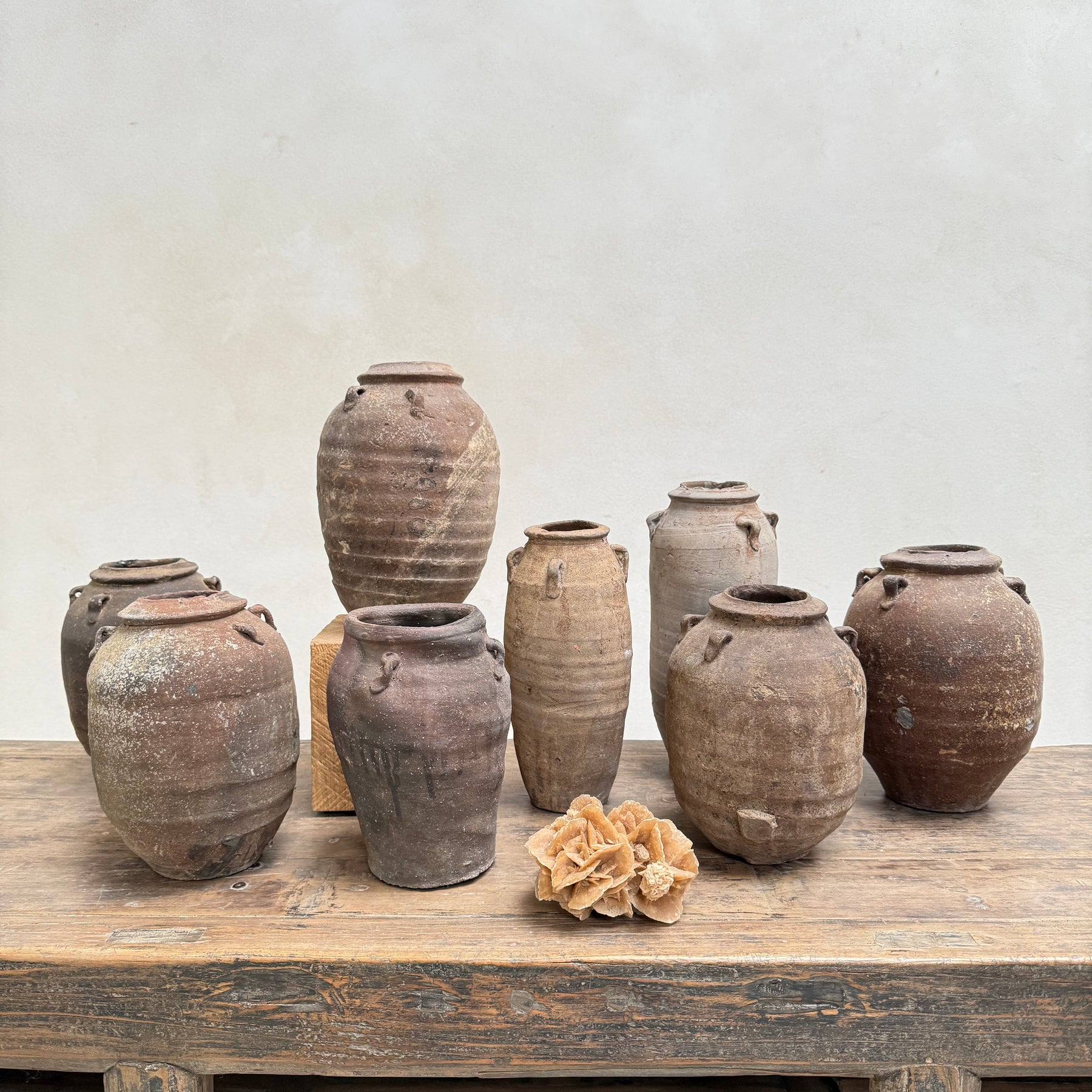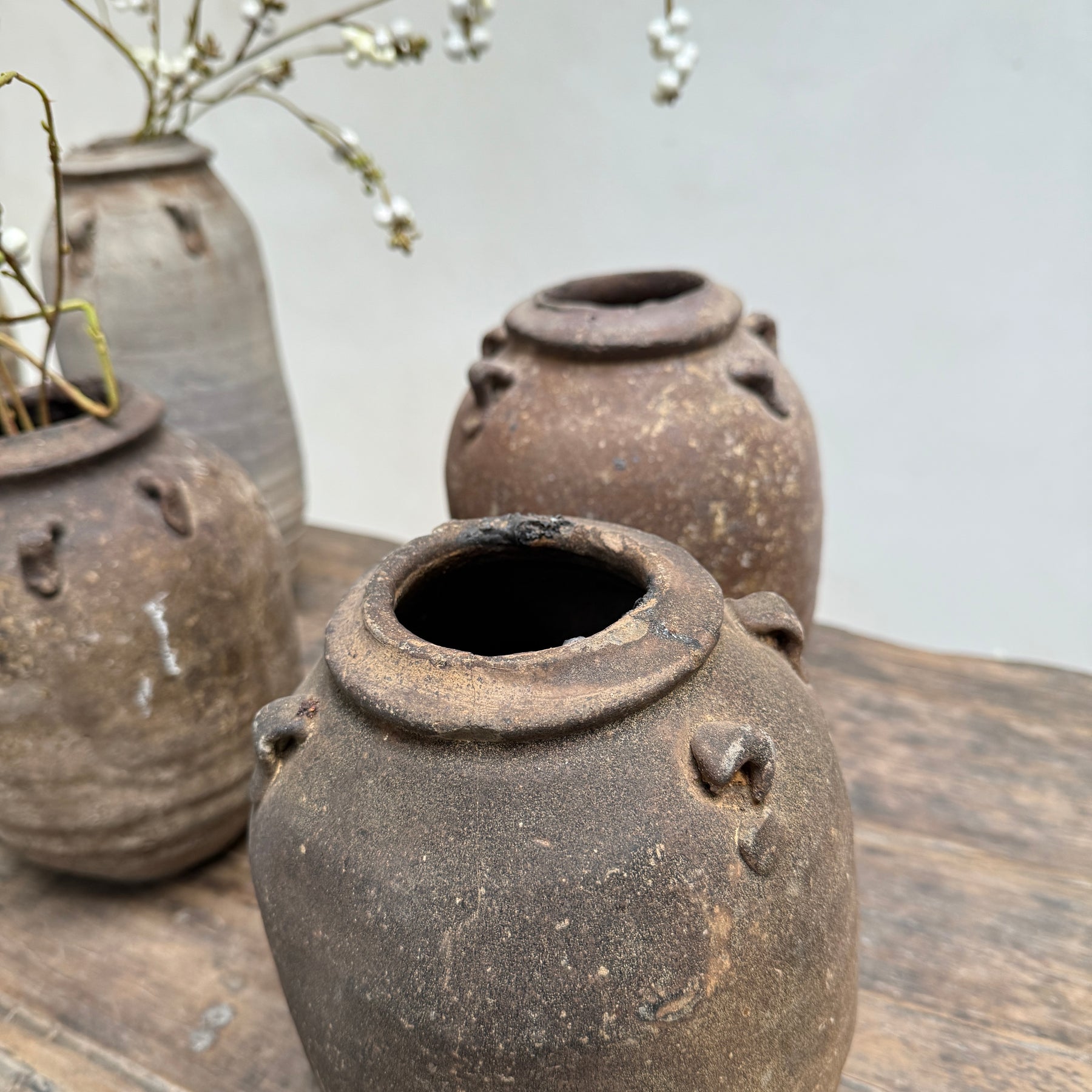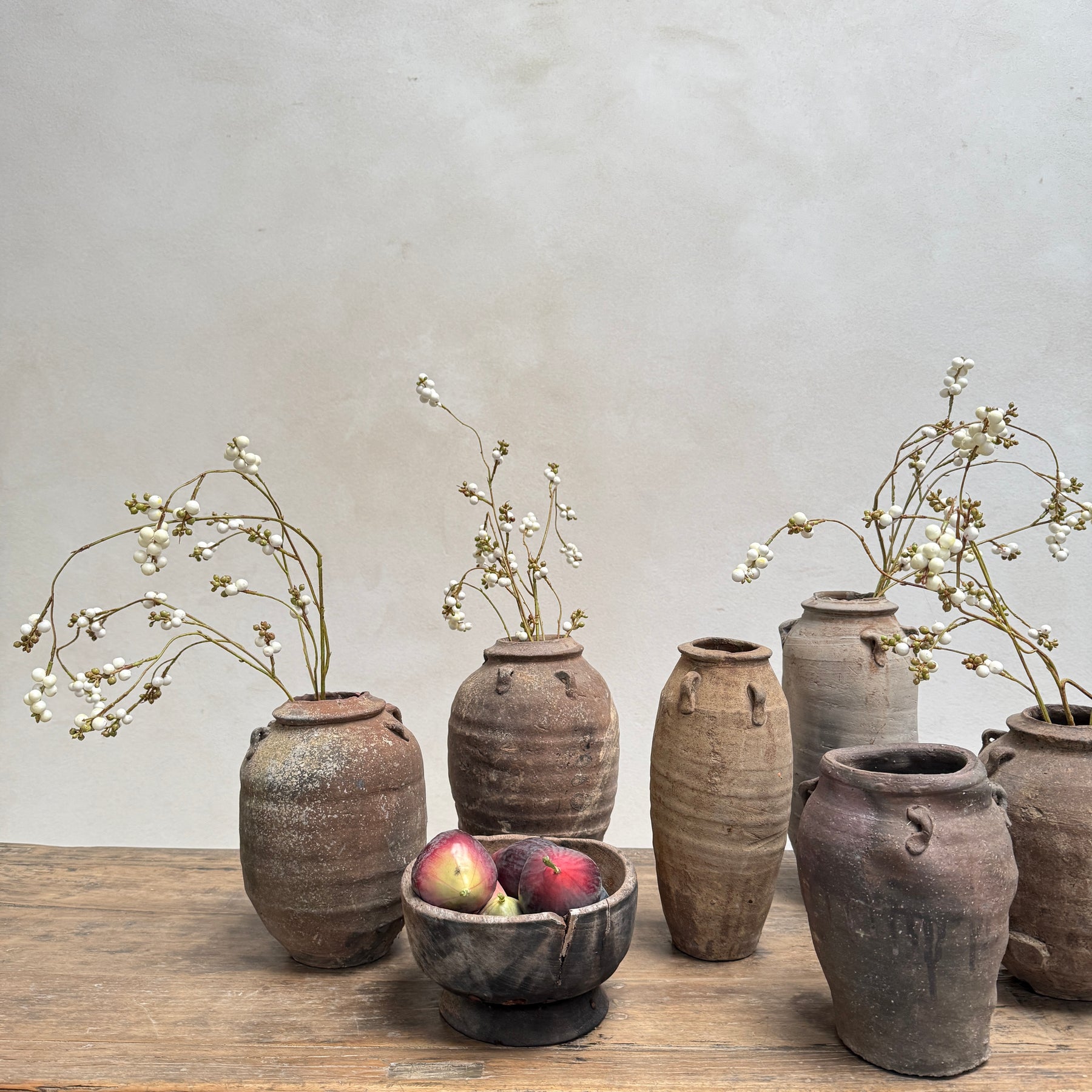 Each vase displays a naturally weathered surface, with soft mineral tones ranging from ash grey to earthy taupe. Time has gently patinated the clay, leaving unique markings, smoke-fired shading, and beautifully imperfect textures that speak to their long history. Their organic silhouettes—slightly asymmetric and wonderfully human—reflect the restrained, minimalist aesthetic celebrated in early Chinese pottery.