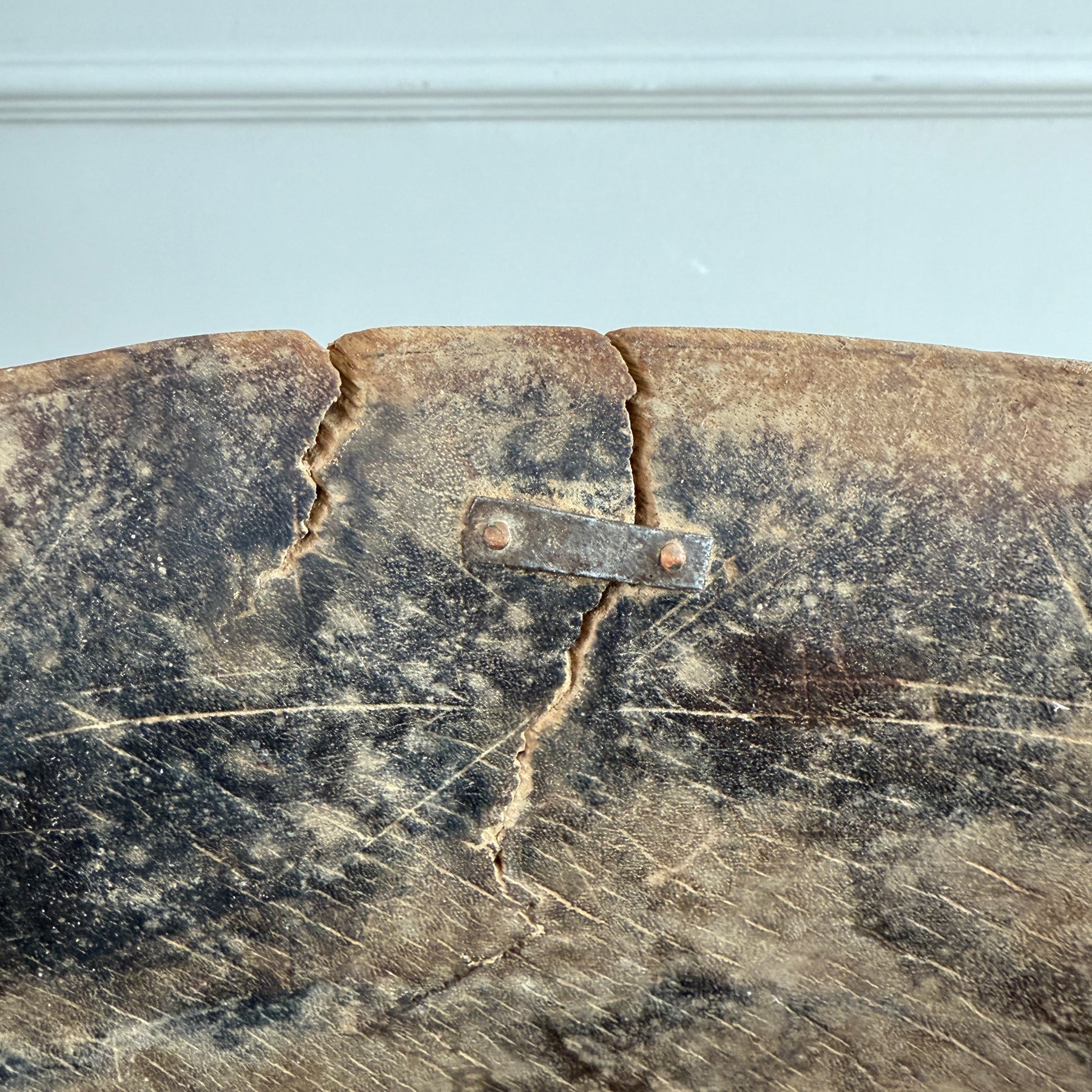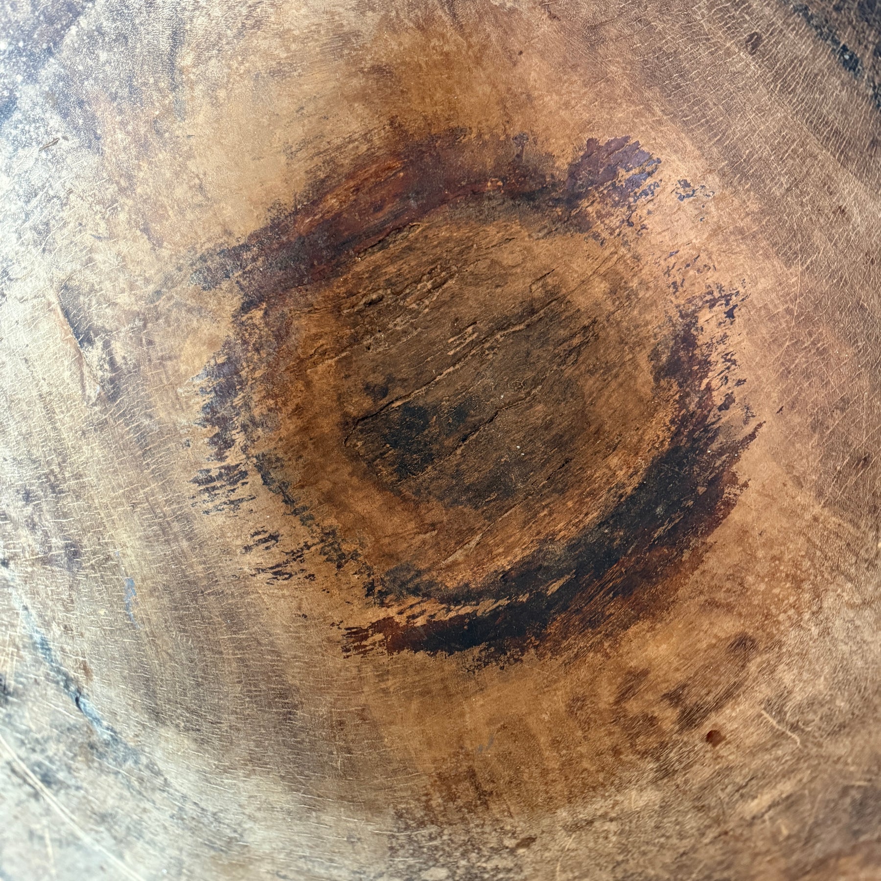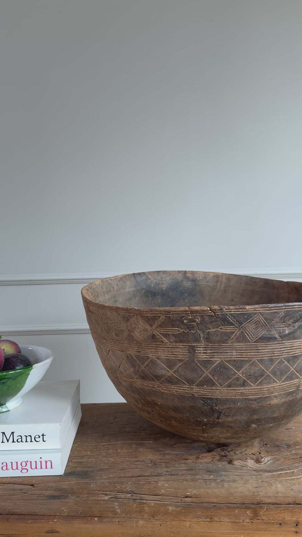 Each of these hand-carved bowls is a one-of-a-kind antique, originally used on Berber farms in the Moroccan mountains. Due to their age and history, expect signs of wear such as imperfections, repairs, and chips. This remarkable rustic bowl carries a rich heritage and offers an authentic accent to enhance the character of a modern rustic interior.