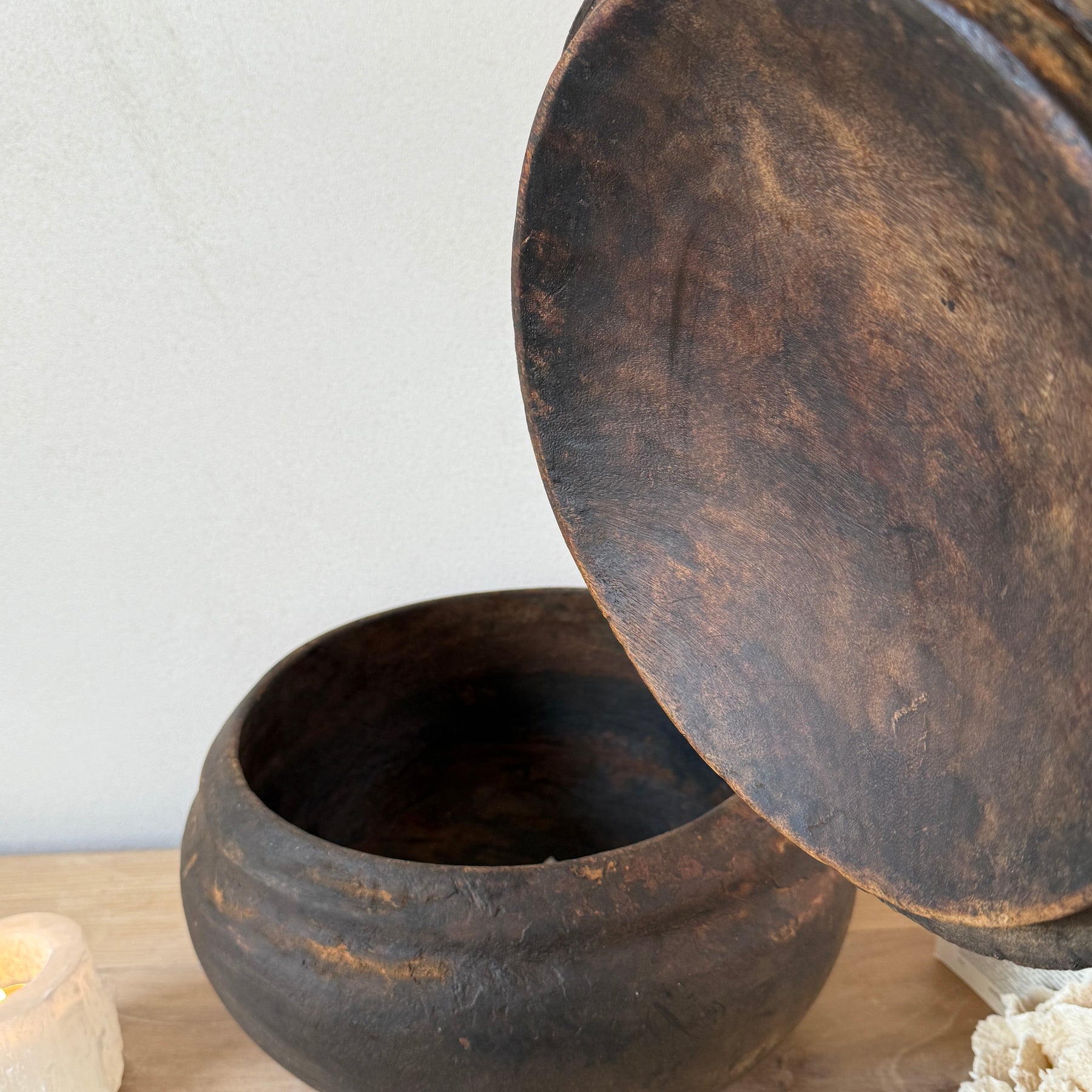 Each of these hand-carved pots is a one-of-a-kind antique, originally used on Berber farms in the Moroccan mountains. Due to their age and history, expect signs of wear such as imperfections, repairs, and chips. This remarkable rustic bowl with lid carries a rich heritage and offers an authentic accent to enhance the character of a modern rustic interior.
