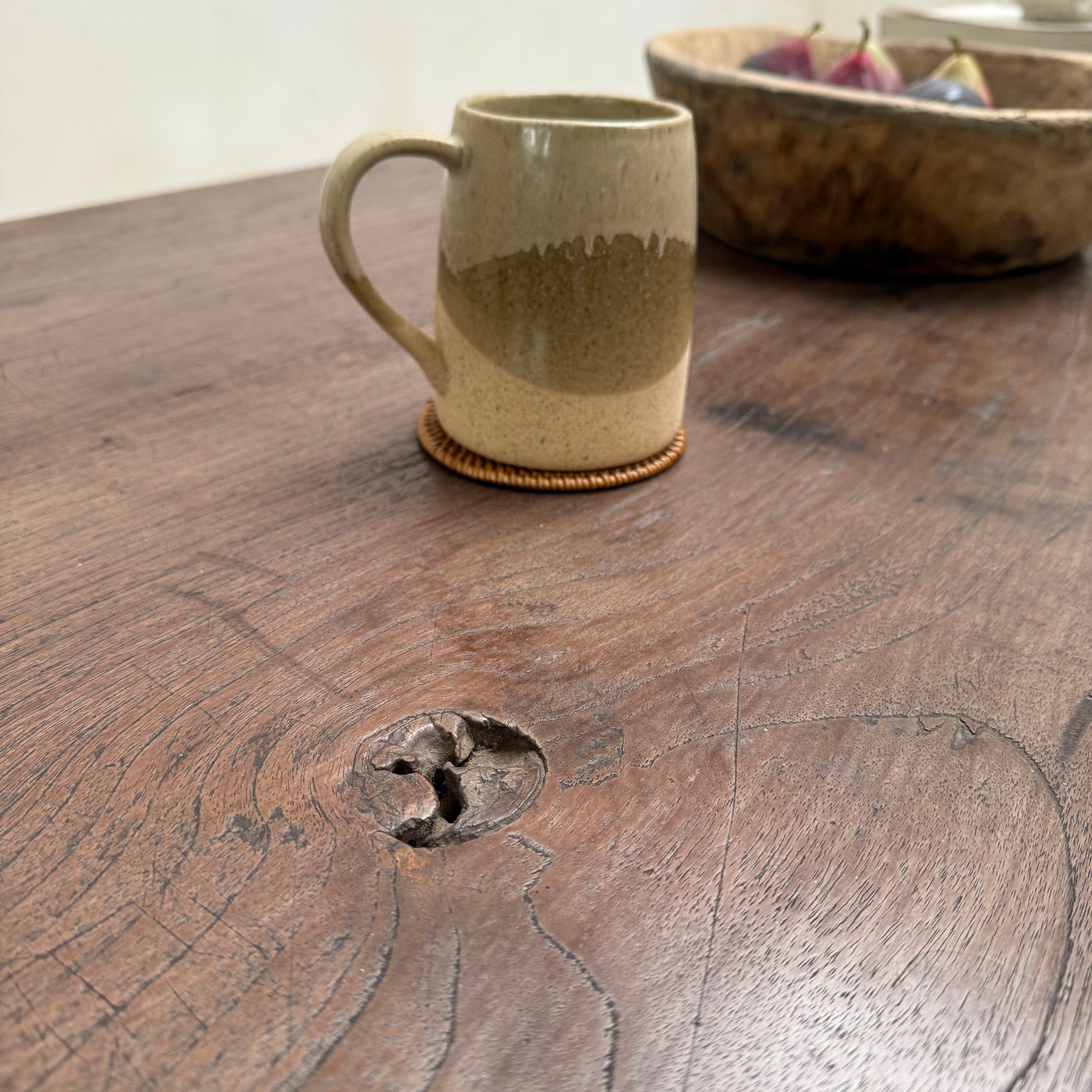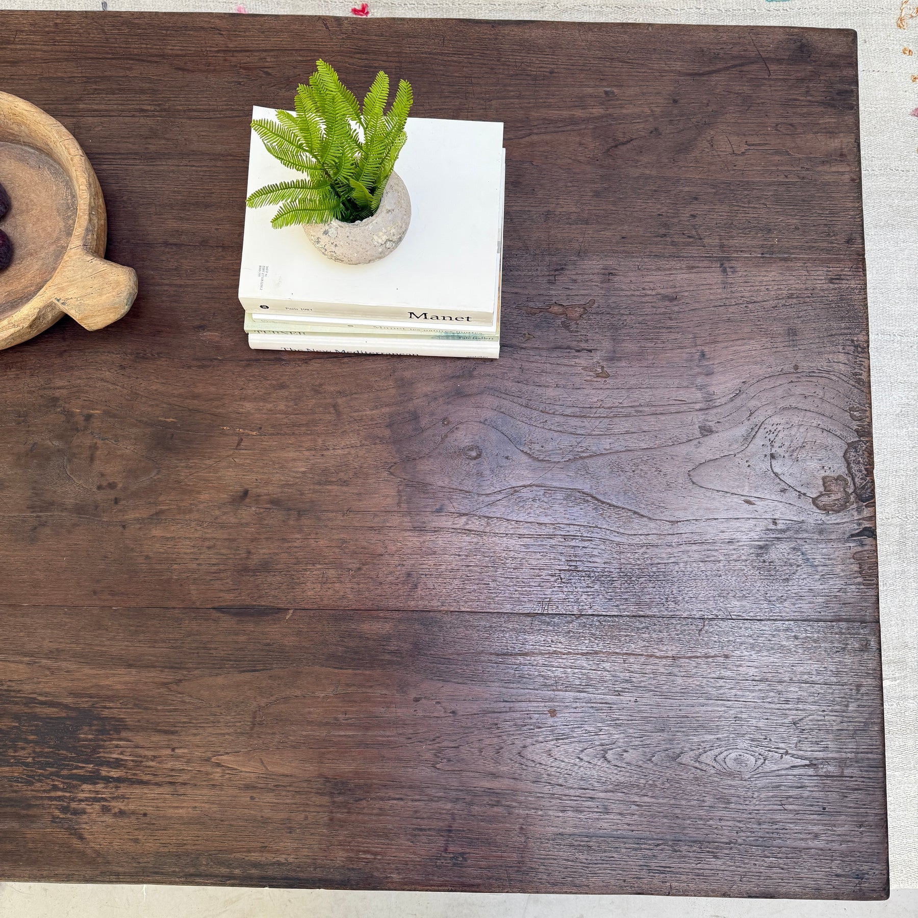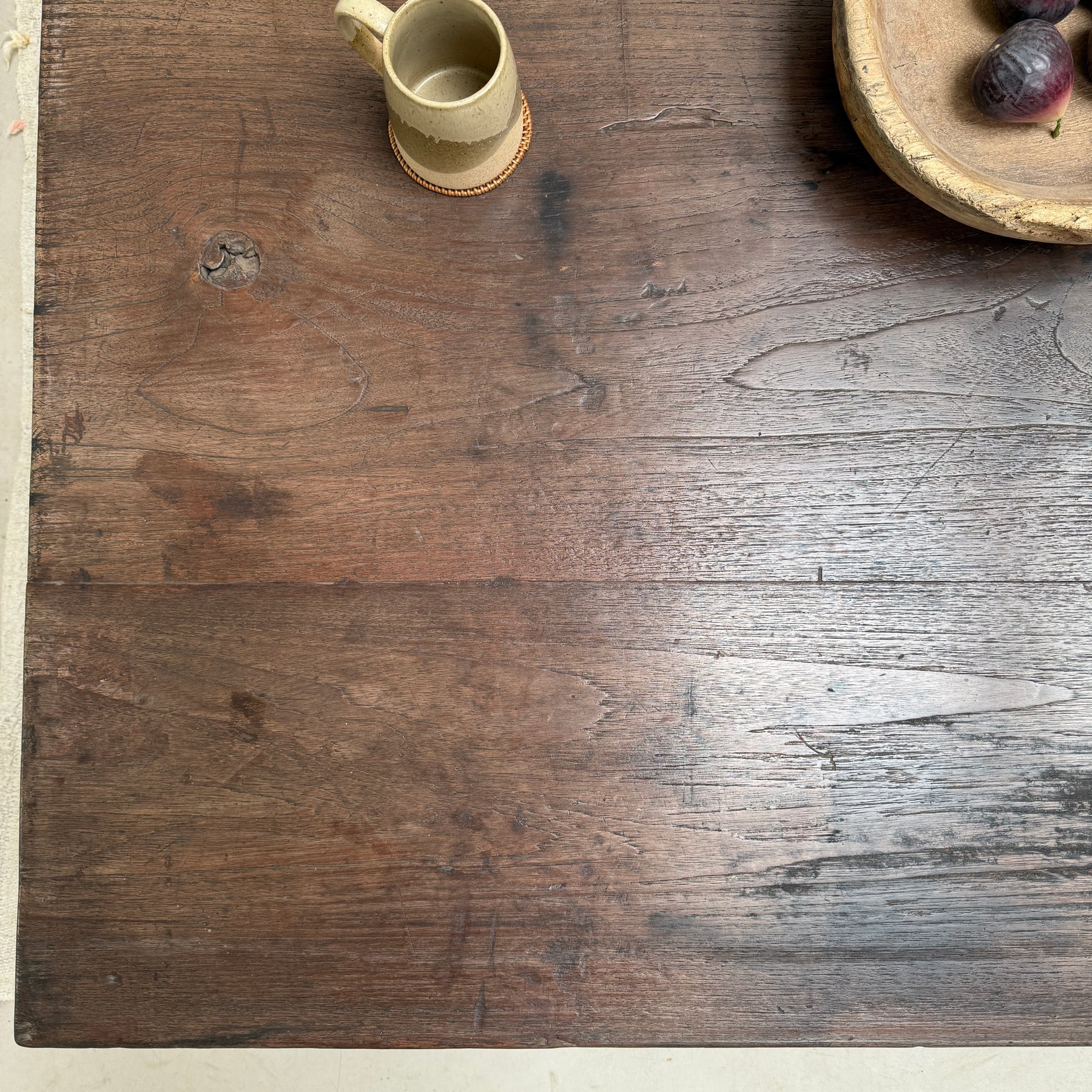 Crafted over a century ago from substantial three teak planks, each measuring approximately 30-40cm across, the table exemplifies traditional joinery with its hand-turned legs and wooden dowel construction.