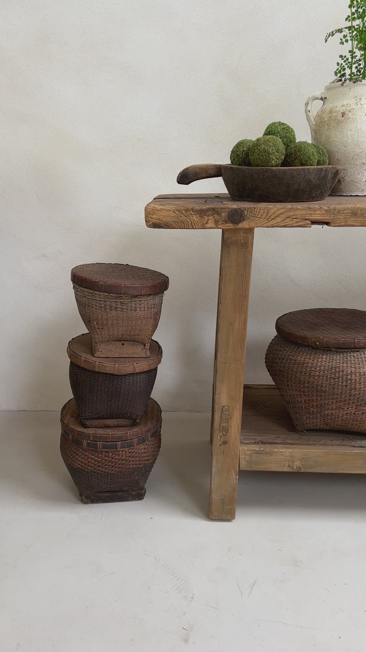 Handwoven from fine hand split sections of bamboo along with natural raffia our vintage Bintan storage baskets come with a bespokely made lid.
